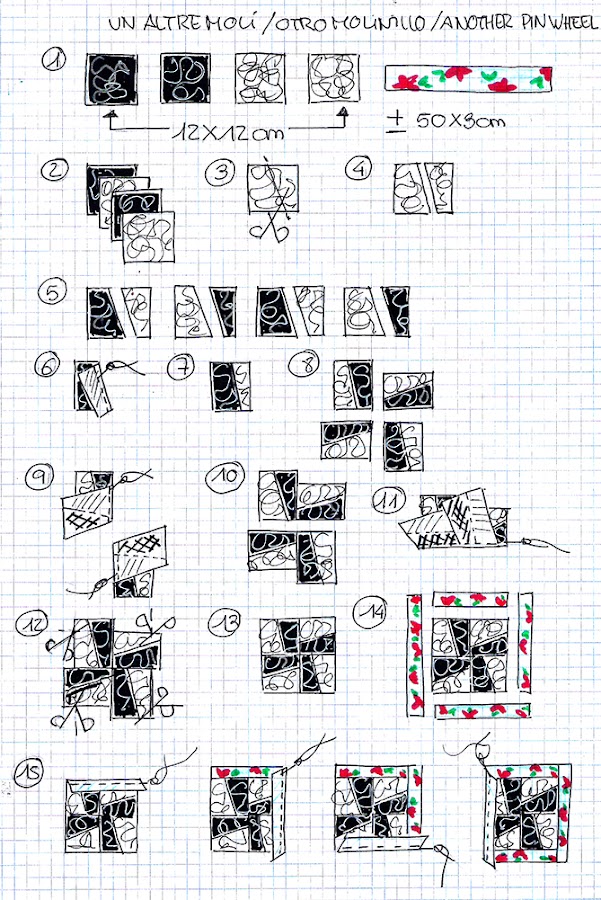 Día a día, Les Antònies, nos estamos encontrando con bloquesde molinillos diferentes. El de esta semana es un muy fácil y divertido de hacer. Nosotras hemos querido darle un cierto aire japonés, pero es ideal para hacer con telas estampadas y colores muy brillantes y alegres.