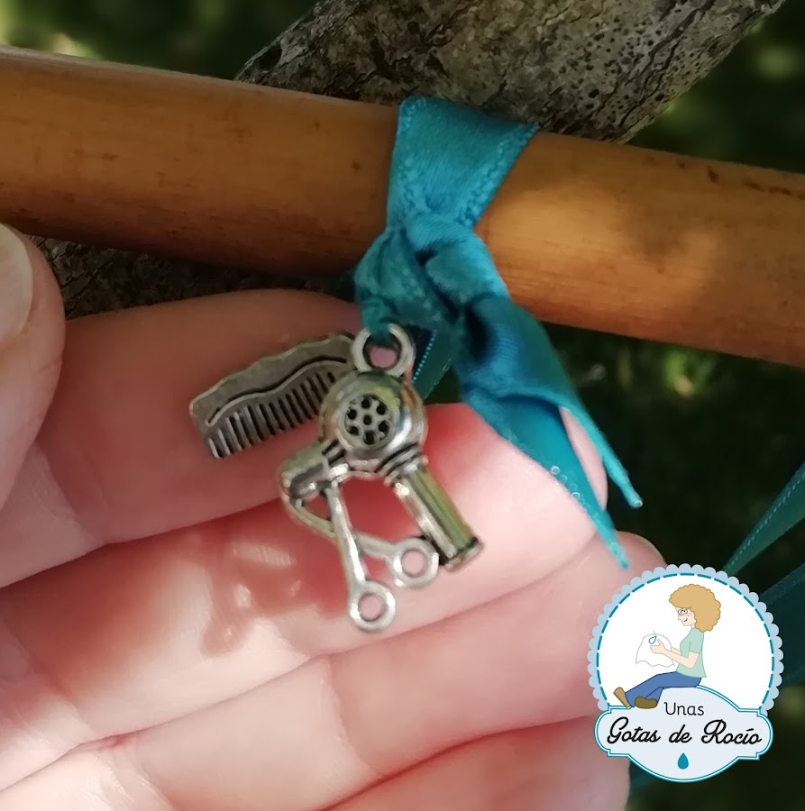 Ese mismo día que compré la tela, encontré sin pretenderlo en un bazar que estaba de liquidación unos charms que eran perfectos, pues eran unos pequeños secadores para el pelo con unas tijeras y unos peines.