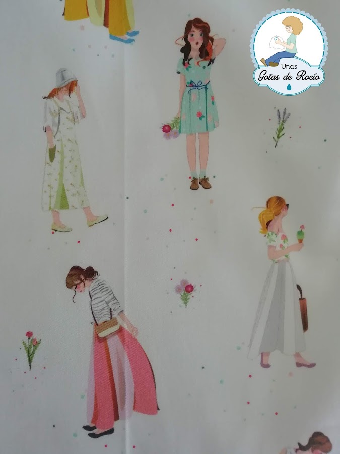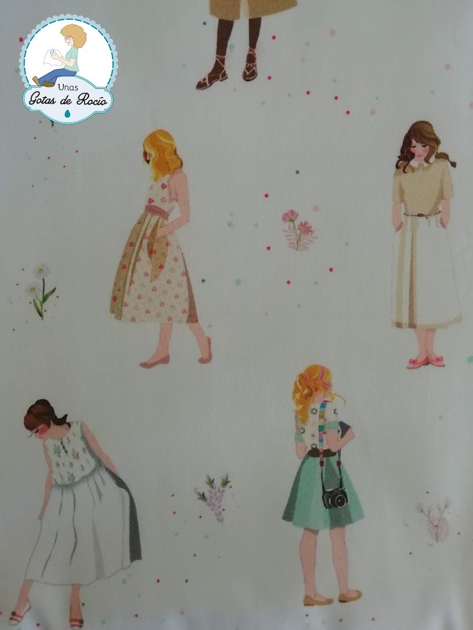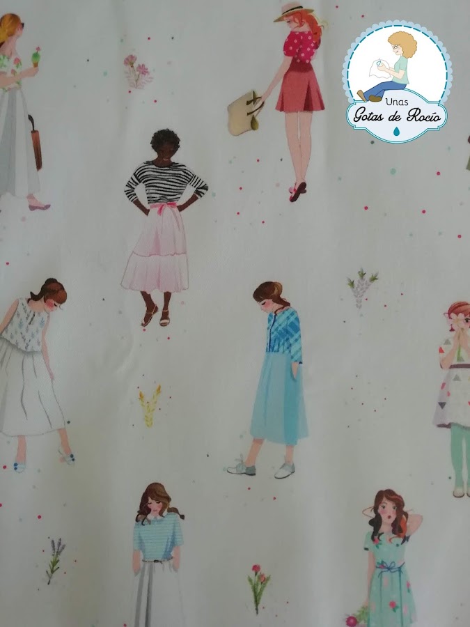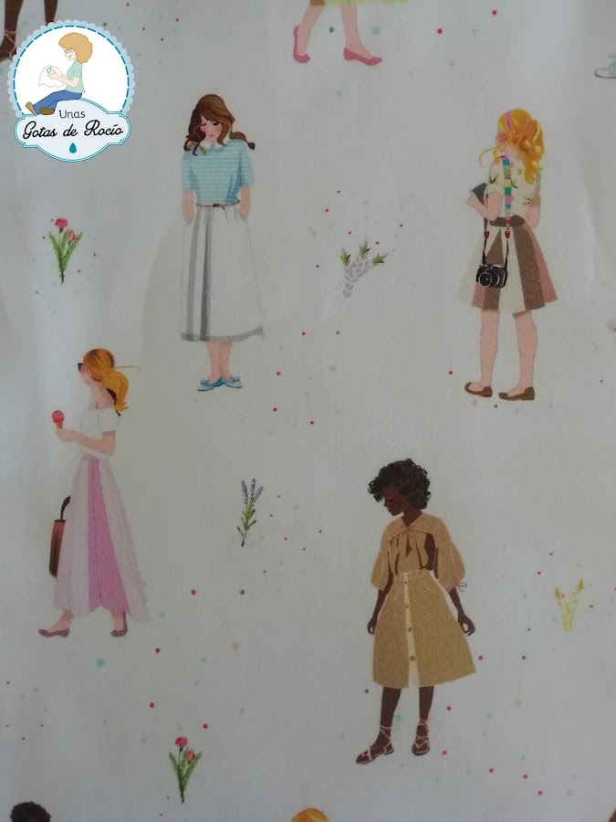 Un día de compras por Sevilla, en Zález vi una preciosa tela, no era estampado floral (que siempre es el recurso más socorrido), tampoco eran motivos geométricos (que no me pegan mucho para María José), ni lunaritos o cuadros (demasiado básicas para la ocasión). Se trataba de un estampado de chicas jóvenes vestidas a la moda, fondo blanco y colores fríos y suaves en sus atuendos. La diseñadora es Inkalily y me pareció una tela ideal para el regalo de María José por su originalidad y delicadeza.
