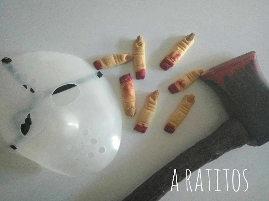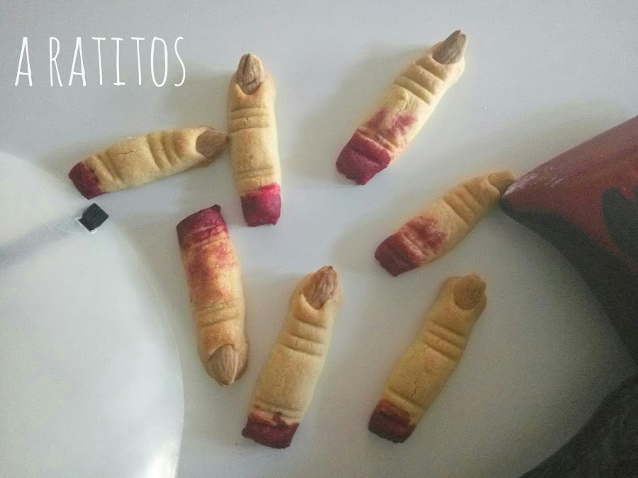 Cortar pequeñas porciones de masa, hacer la forma del dedo. Poner la almendra como si fuera una uña.