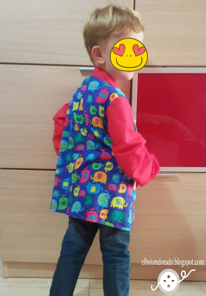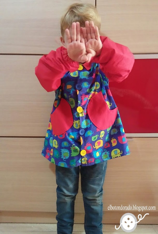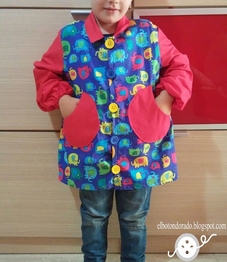 Esta vez no he utilizado los famosos cuadros vichy y he elegido esta tela de elefantes tan colorida. Como el fondo es azul, la he combinado con rojo.