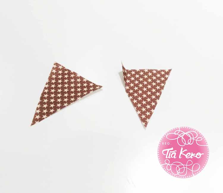 Lo primero que vamos a hacer es cortar las velas de nuestro barquito velero. Para ello recortamos dos triángulos iguales en la tela elegida.