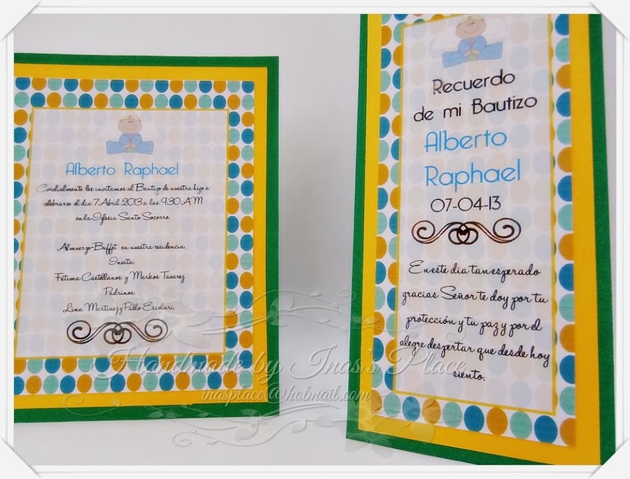 Mi propuesta para iniciar la semana es una invitación para Bautizo con unos colores fuera de lo normal,dicho asi,pq sabemos que son muchas las personas que prefieren los colores "tradicionales",como el blanco,azul pastel,etc...pero en este caso la cliente deseaba algo diferente y que llamara la atención de sus invitados.