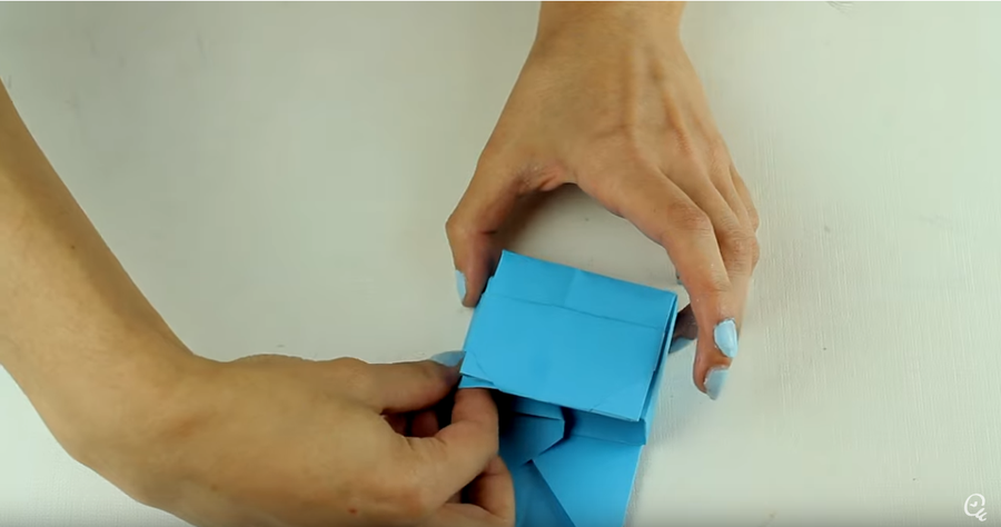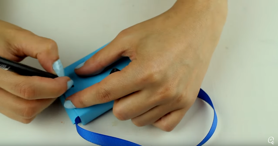 3. Una vez que estén todos hechos, solo tendrás que unirlos con silicona para darle forma al mini bolso origami. Pega los extremos de la cinta cada uno en un lado del bolso.