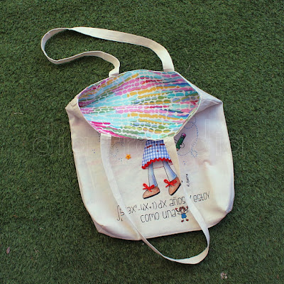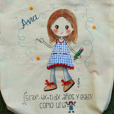Estuvimos estudiando qué podríamos hacer para que fuese lo más personalizado posible. Arancha me dijo que le gustaban mucho los bolsos que hacía para las maestras en el fin de curso, así que, como su prima es profe de educación especial, eligió hacer un bolso de este tipo para ella. Le gustó uno de los modelos que había hecho recientemente que representaba a una seño con su baby y para completar la personalización, le pusimos su nombre de la forma en que suelo personalizar las camisetas y bolsos.
