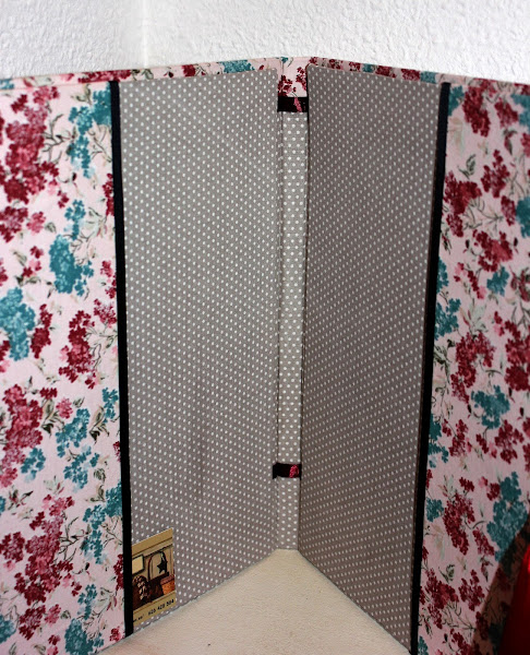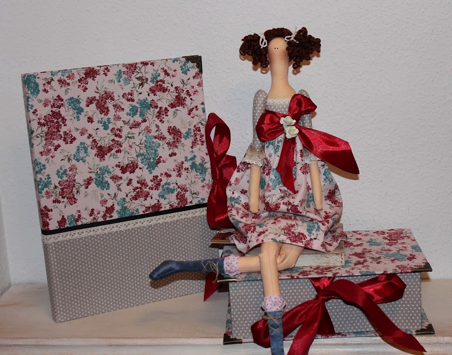 Un conjunto precioso éste que ha salido del taller rumbo a Burgos: Carpeta forrada en tela, caja libro y tilda. Único requisito: Las mismas telas.
