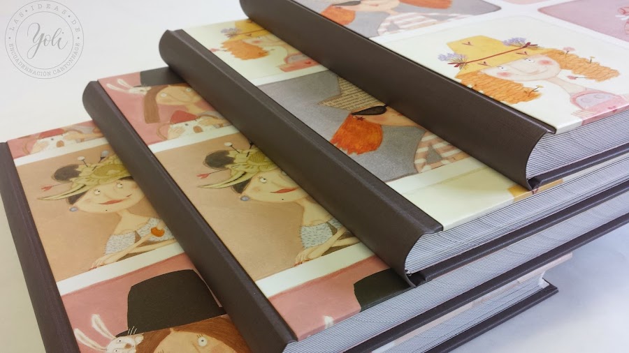 Para la parte trasera y el lomo he elegido tela brillanta en marrón y para la portada este precioso papel, que he glasofonado, para que con el uso no se deteriore.