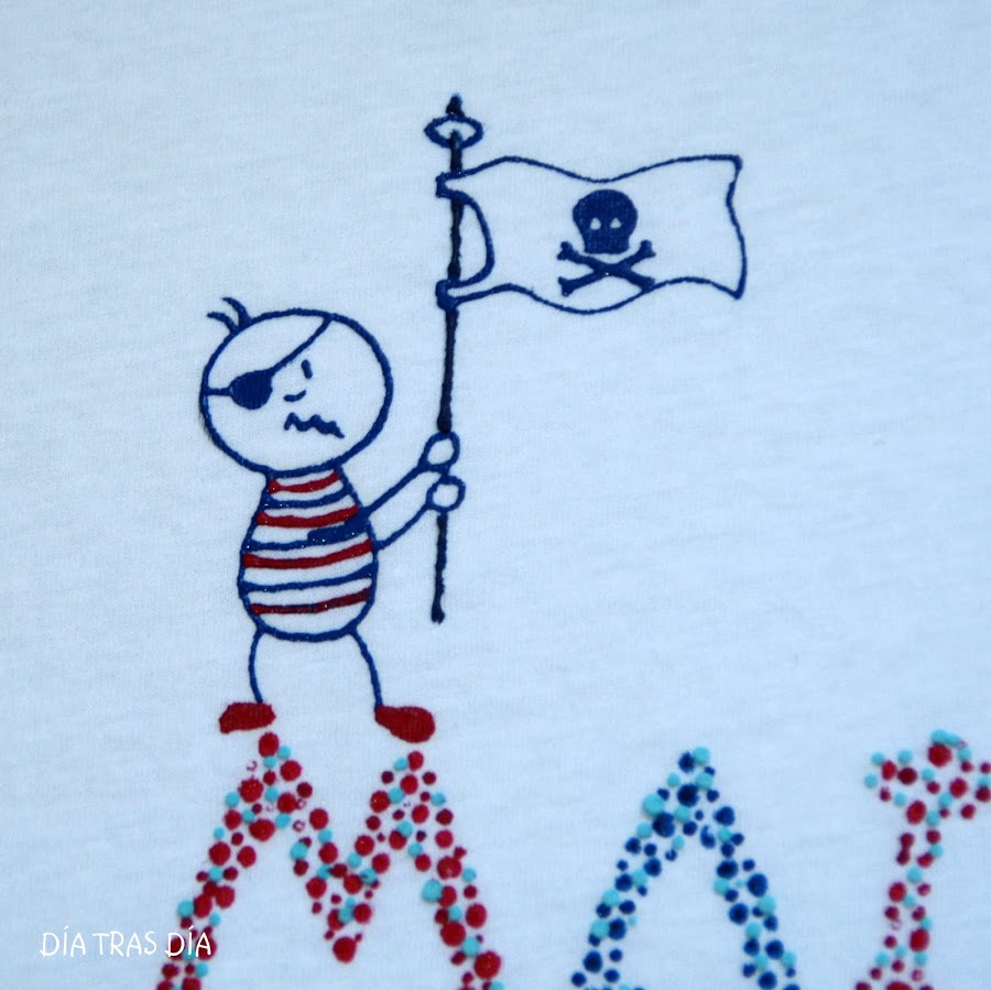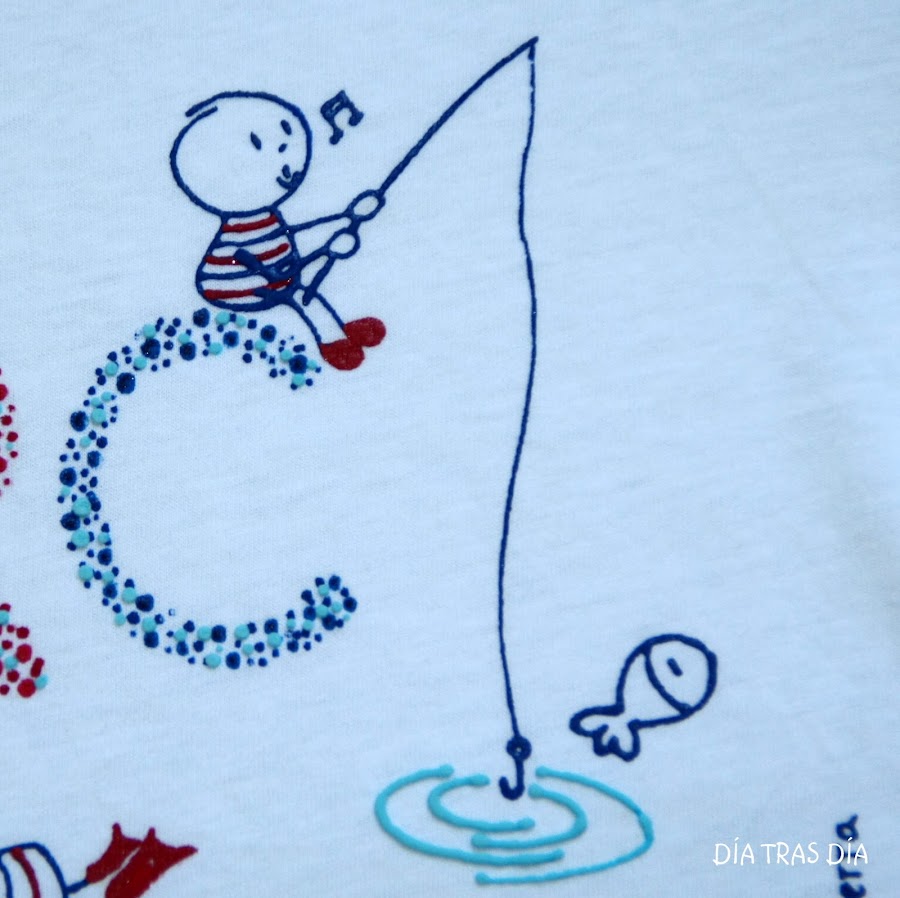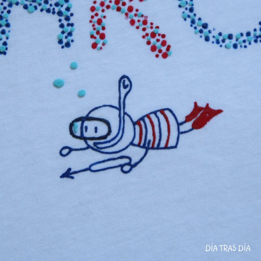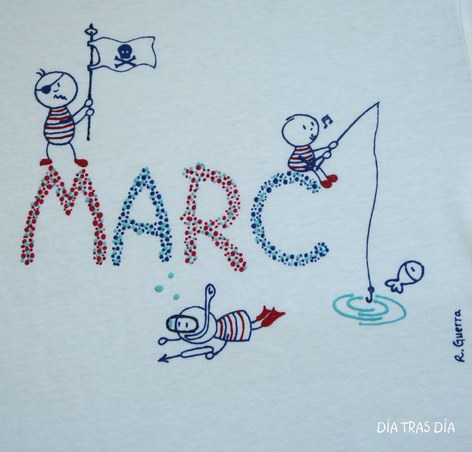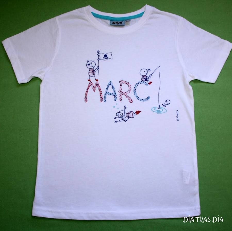 Y para Marc, cuando hablamos de hacer el intercambio, Celia me comentó que le podía hacer la que yo quisiera, que seguro que le gustaría. Y como pista me dijo que le encantaba todo lo relacionado con el mar. Cuando saqué el modelo de camiseta "Monigotes con nombre", me dijo que le gustaba mucho ese diseño. Así que al final decidí hacerle una camiseta de "Monigotes con nombre" con temática marina. Y el resultado fue este: