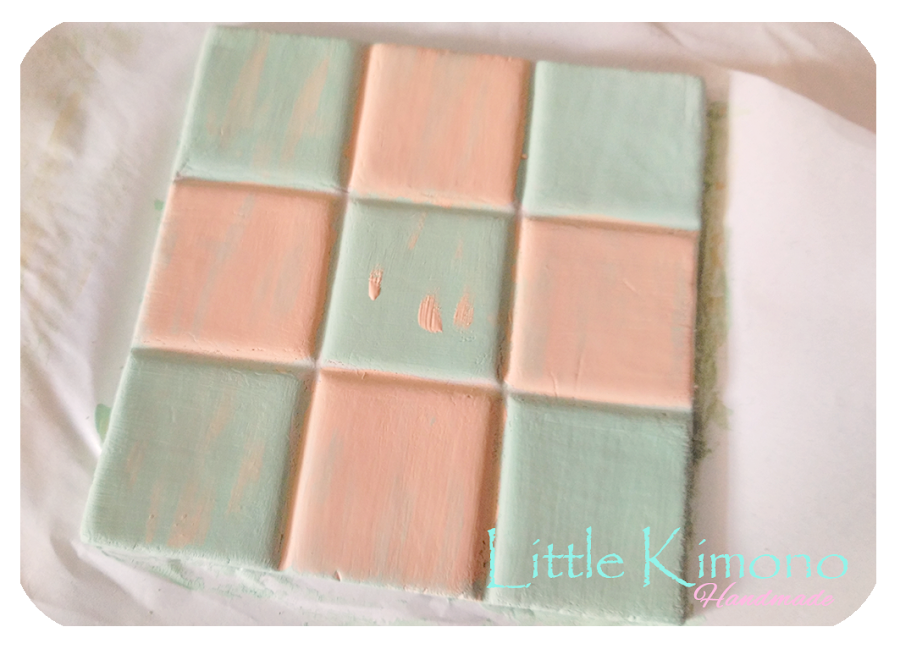 2. Segundo paso: Después de marcar los cuadrados de 3x3cm procedemos a pintar, en este caso con tonalidades acorde a un estilo costero. Para dar un aspecto desgastado, podemos dar unas pinceladas (con el pincel casi seco) con pintura contraria al color que teníamos en el cuadro ya pintado, como muestro en la foto ;)