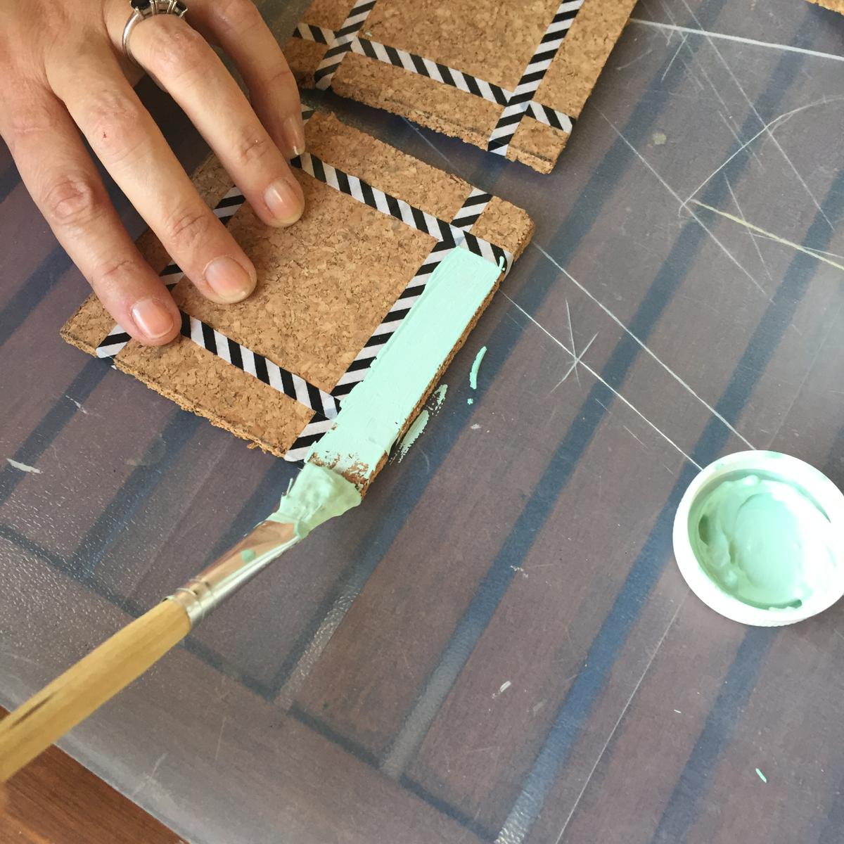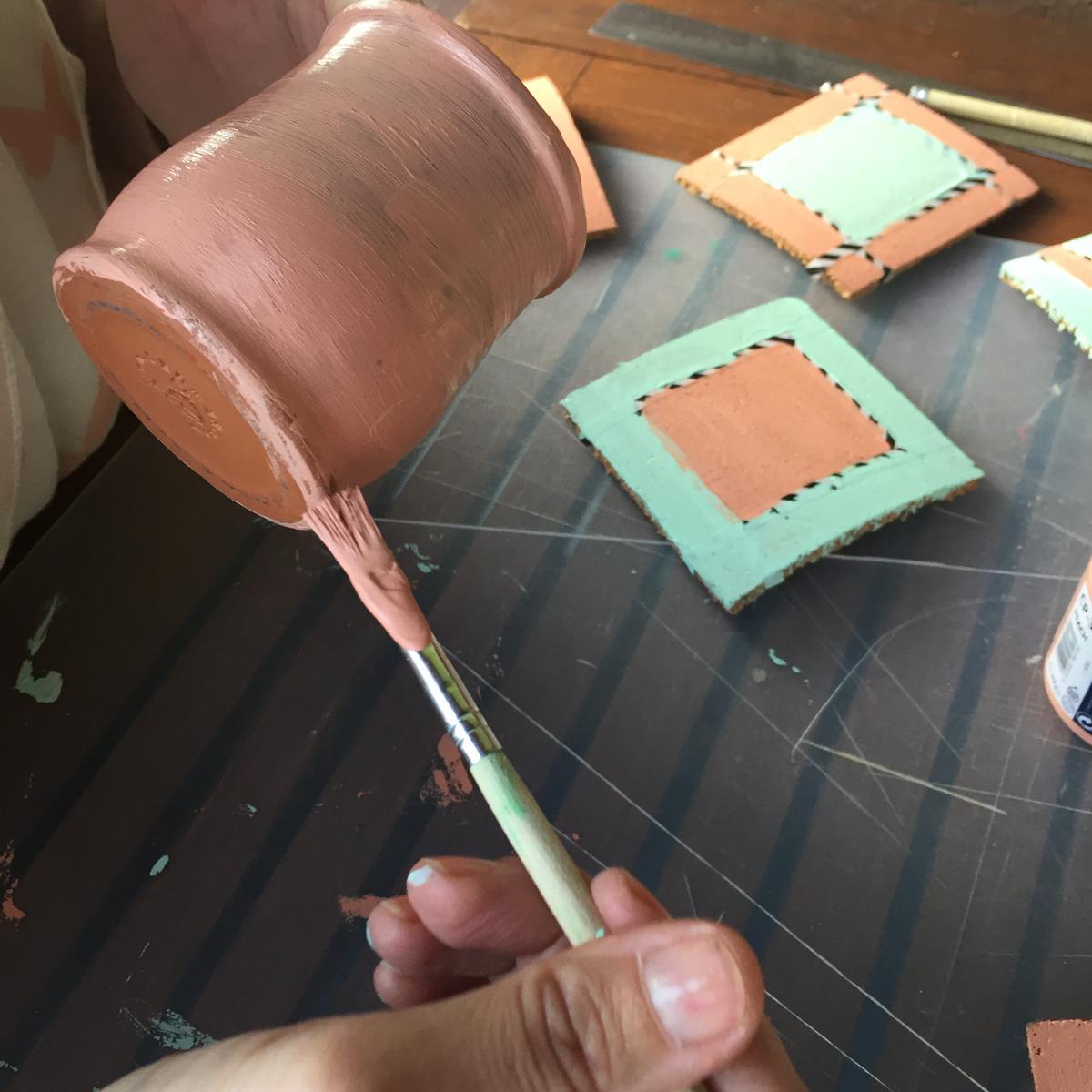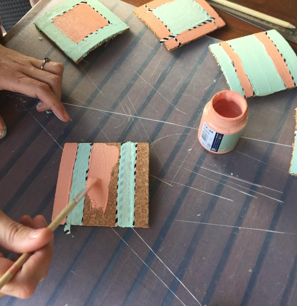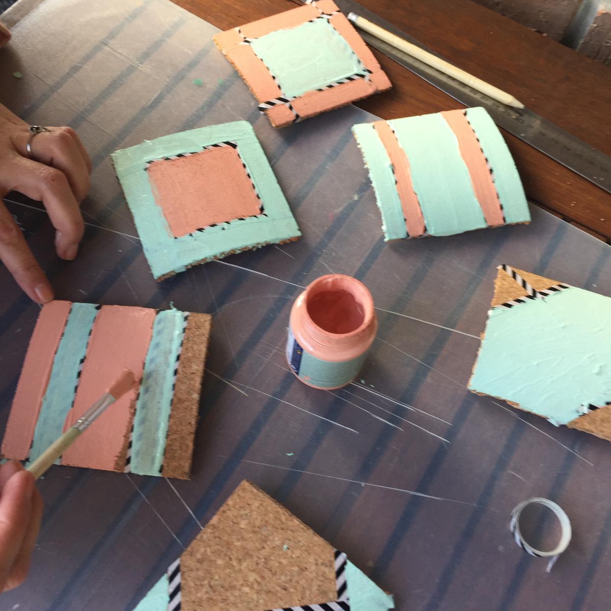 Paso 3: pintamos los posavasos, nosotras hemos usado dos colores, y hemos pintando cada par con los colores inversos.