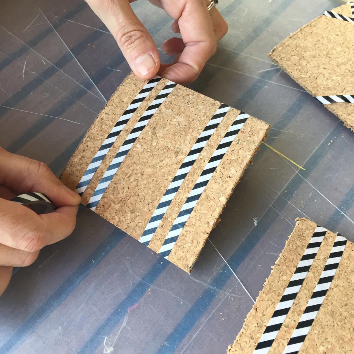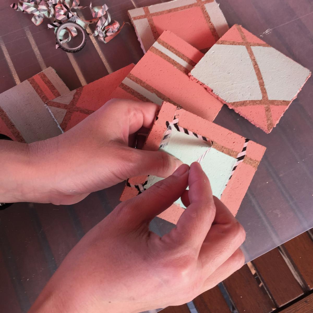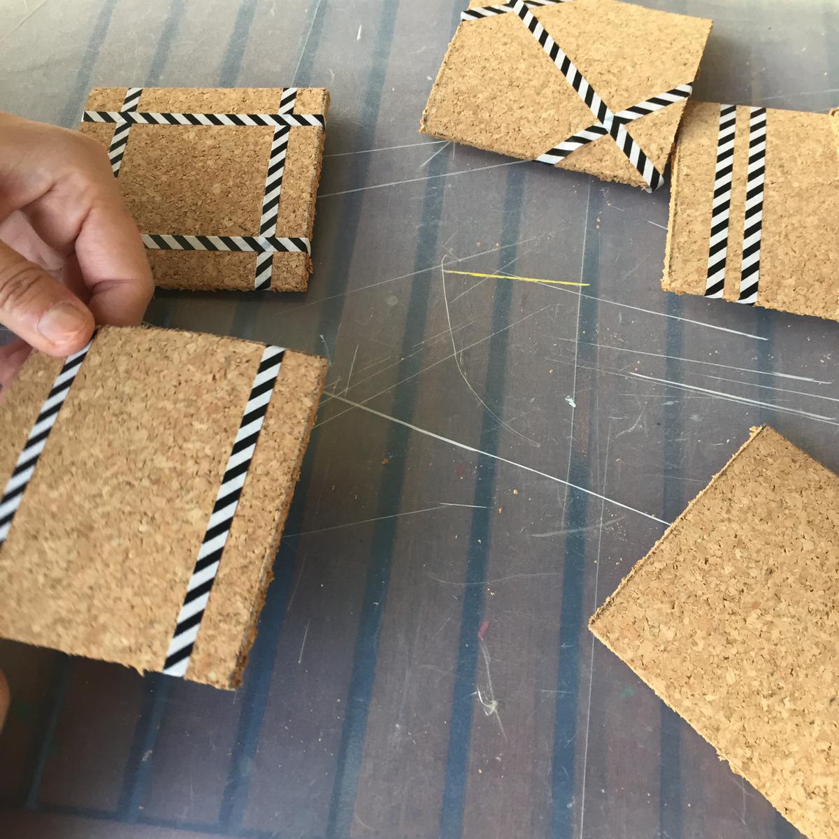 Paso 2: diseñamos el dibujo que vamos a hacer en los posavasos, nosotras hemos decidido hacer dibujos geométricos, para ello usamos el washitape para dibujar, hemos hecho 3 diseños diferentes dos de cada tipo.