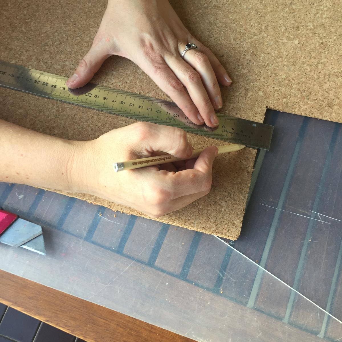 Cúter, washitape estrecho, pinceles, lápiz y regla