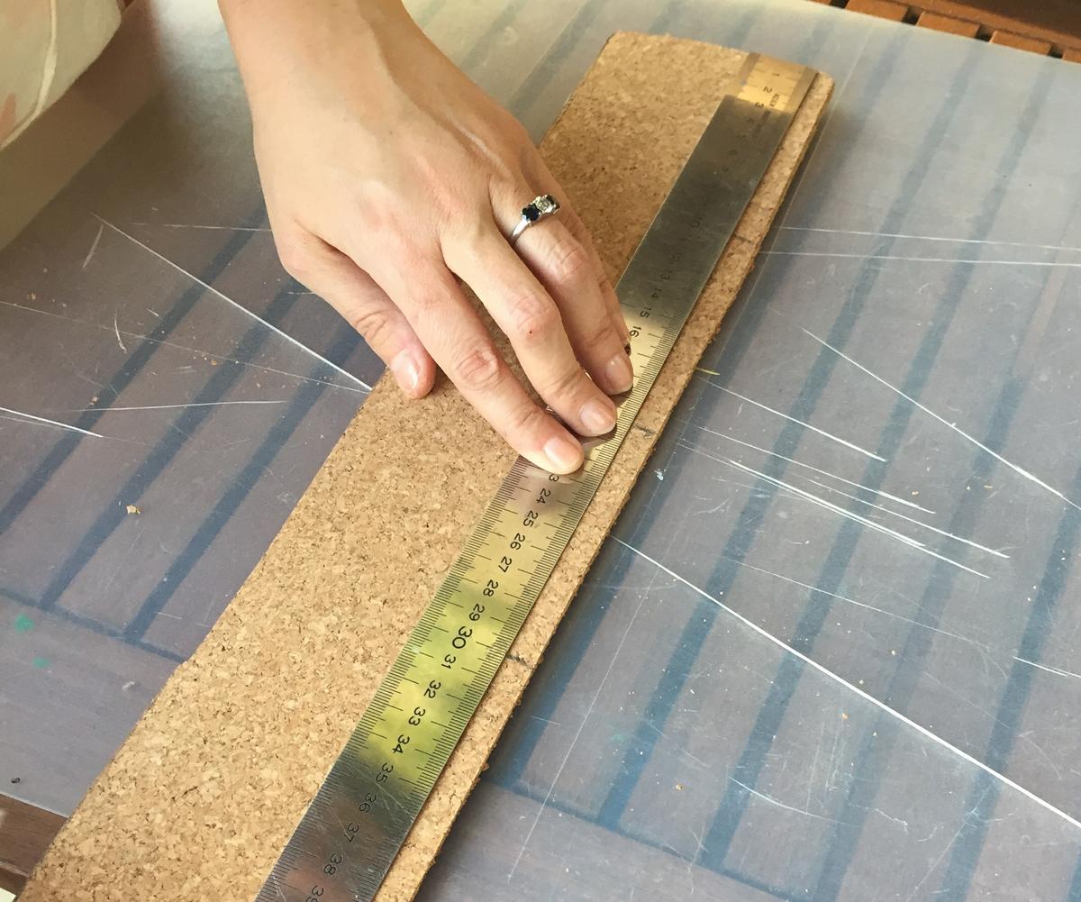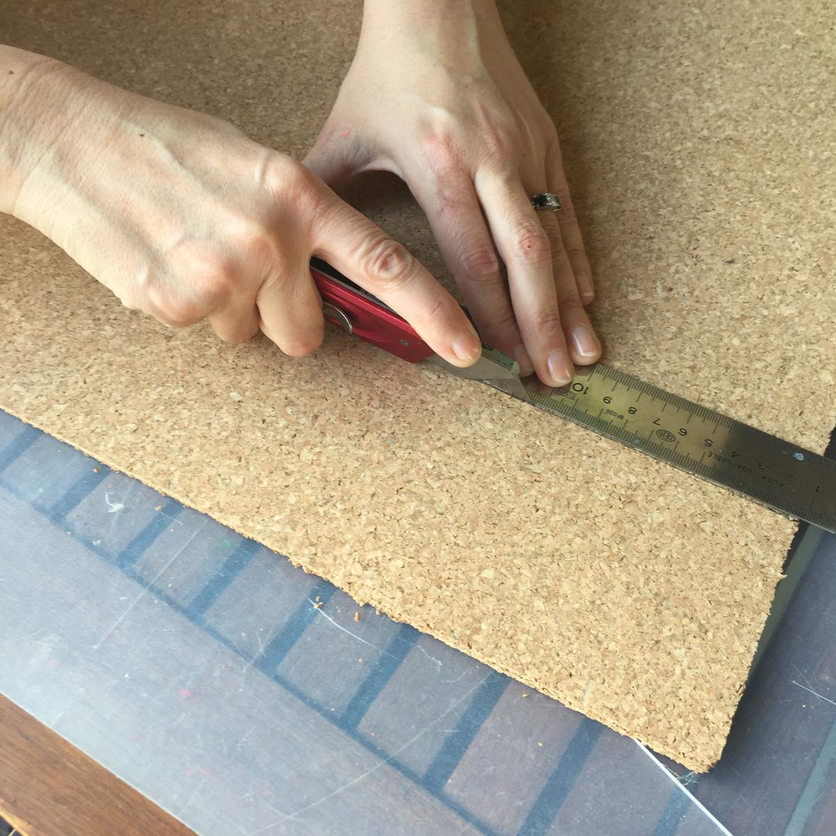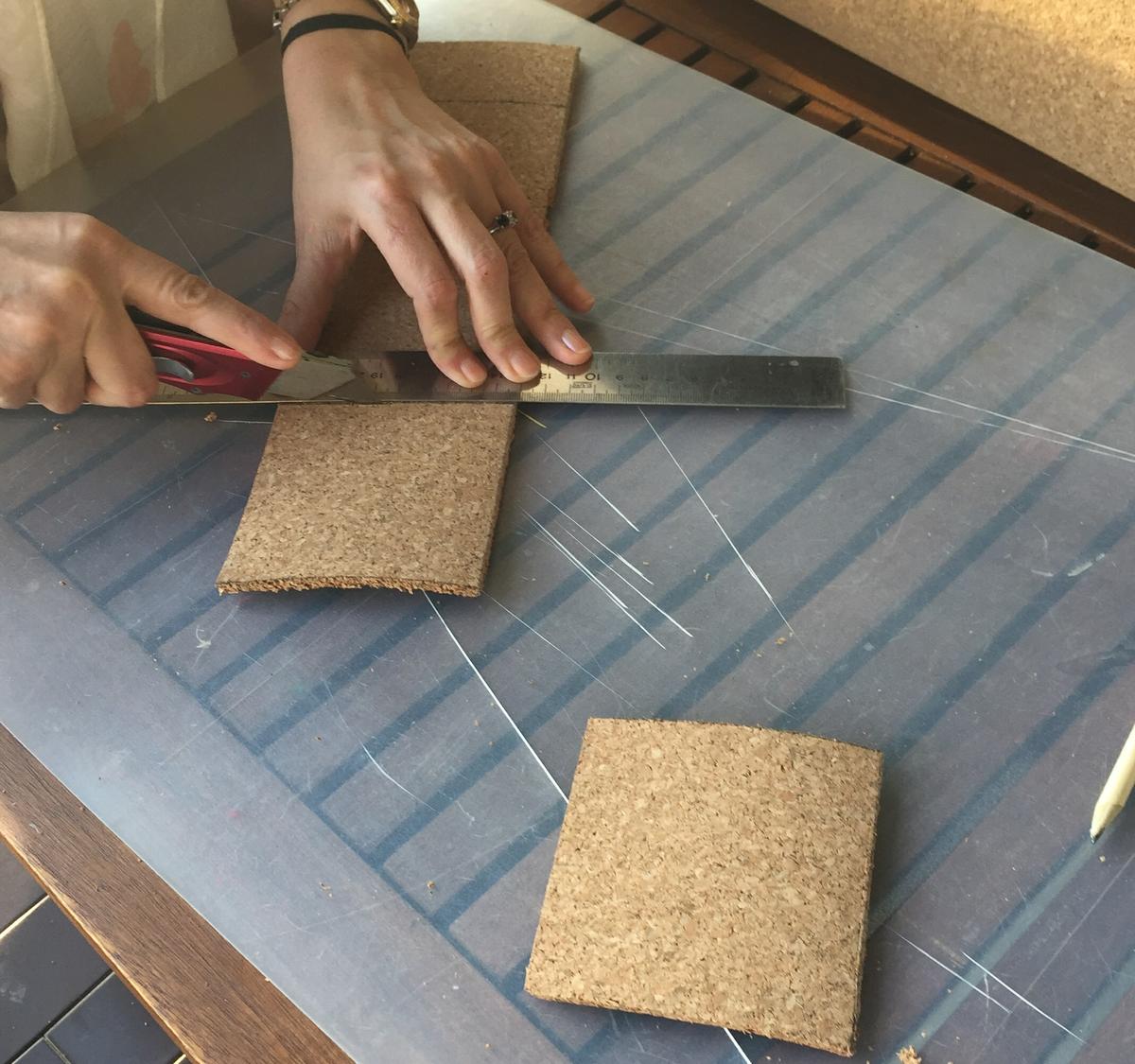 Paso 1: con ayuda del cuter cortamos 6 trozos de corcho de 10 x 10 cm