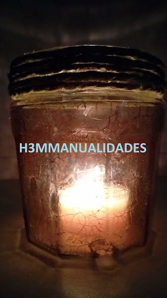 Tras la limpieza del bote, quitando todo resto de pegamento de etiquetas y demás, di directamente sobre el cristal craquelador en dos pasos. Viene en dos botes, con sus números, 1 y 2. No hay que hacer nada especial más que seguir las indicaciones del fabricante: una vez seco el 1, se aplica el dos y van apareciendo la grietas. Este sistema viene bien cuando se quieren rellenar las grietas surgidas, no es para que se vea el color que esté debajo (para eso se usaría craquelador de un paso). Aquí creo que se aprecian bien: