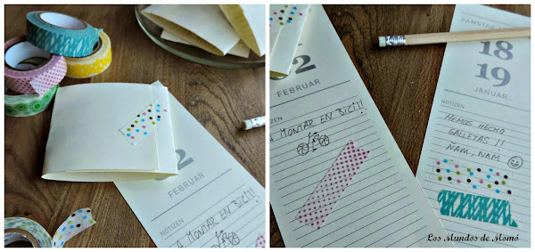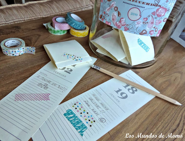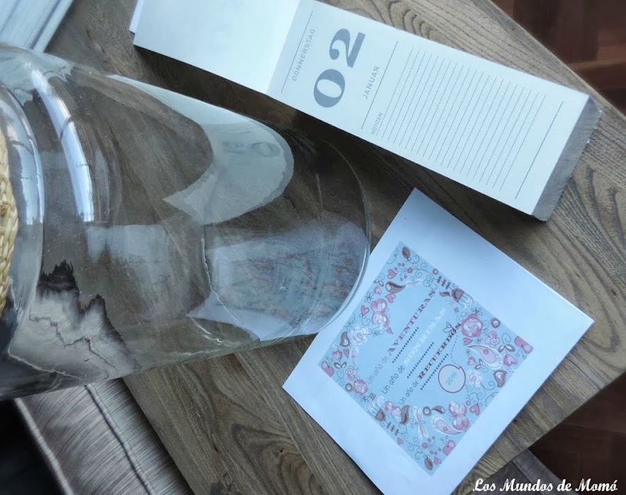 Con un bote de cristal, una tarjeta con el mensaje impreso (podéis descargaros la primera imagen del post) y pequeños papeles, podremos empezar a trabajar. En mi caso en lugar de papeles voy a utilizar un calendario que me trajeron los Reyes Magos (está en alemán, pero se entiende!!) y así además podremos recordar cuando pasó...