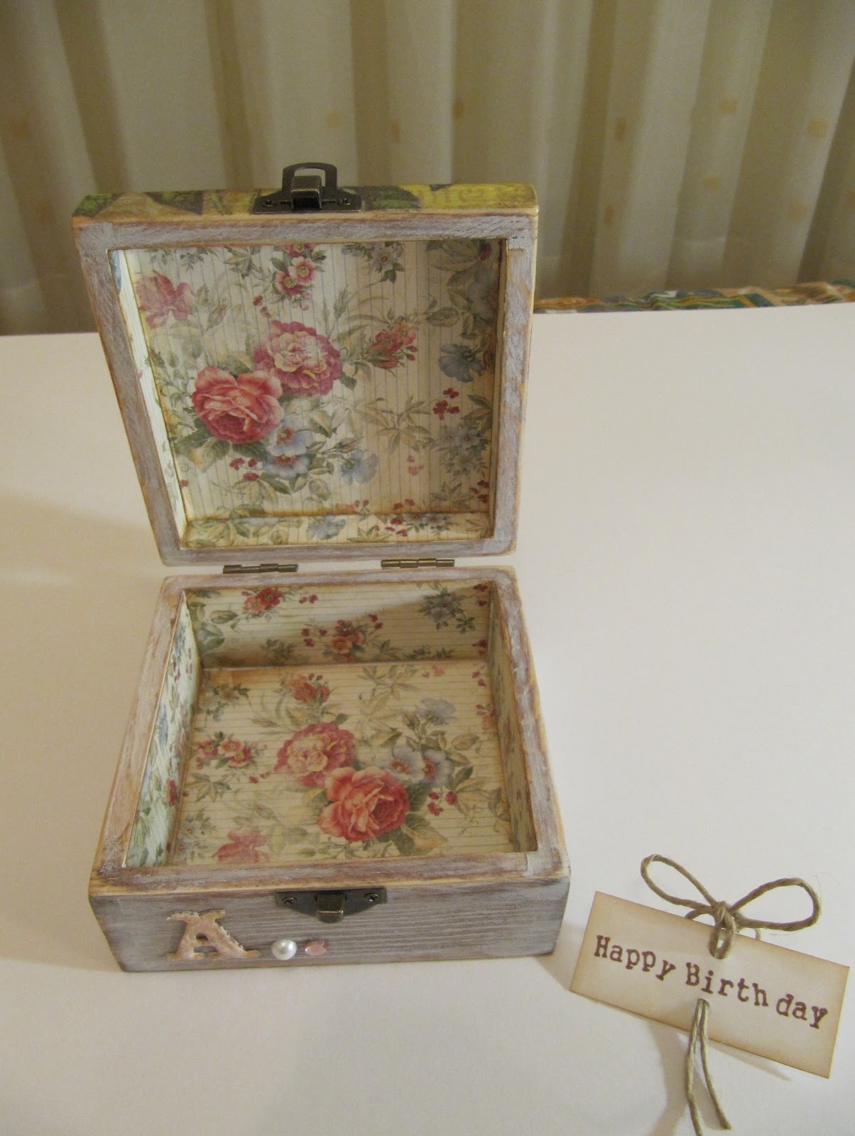Siempre me han gustado las cajas de madera con ese aire antiguo. Cuando era pequeña recuerdo una que la tenía mi abuela en una alcoba me encantaba mirarla y remirarla!, la madera tenía ese color que van cogiendo con los años, las bisagras robinadas y una imagen de una señora elegantemente vestida. Con los años descubrí que la imagen de la señora no era pintada, como entonces me creía yo, si no fue conseguida con la técnica de decoupage, a partir de ese momento el decoupage es una manualidad o arte que me gusta mucho, aunque no hago mucho, cualquier trabajo hecho con esta técnica me vuelve embelesar y recordar esas horas pasadas en las tardes calurosas de agosto por el sur Quise utilizar el decoupage para esta caja. La tapa esta hecha con una servilleta, la barnice y después le puse una fina capa de Crackle Accents, consiguiendo un suave craquelado. La parte de abajo quise que me quedase como una madera con una pintura gastada, y lo conseguí con gesso, barniz oscuro y lijando en cada capa de pintura por lo que se ve la madera de abajo sin tratar y varios colores en ciertos puntos que le da un poco ese toque especial que le puede dar el paso del tiempo, quiero deciros que no se si se hace así, lo hice un poco a mi rollo, pero me ha gustado como ha quedado. El interior esta forrada en las paredes con un papel de scrap entintado Para terminar he puesto la inicial de la persona a que se la voy a regalar y unos brillitos