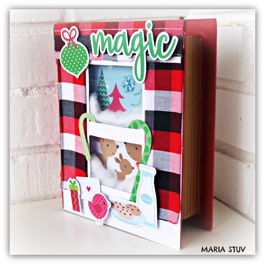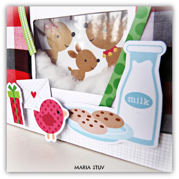Es un precioso libro de Navidad con ventana incluida por la que se ve la nieve y además a la familia de renos del layout que os enseñe ayer. Ya que no tengo maquinitas de esas prodigiosas que te cortan lo que quieras, hice yo misma la ventana con el método tradicional y le añadí unas cortinas de cuadros para darle mas realismo. Como veis la escena refleja la leche y galletas para cuando venga Santa al que también le han dejado un regalito con una carta en agradecimiento de todos sus servicios.