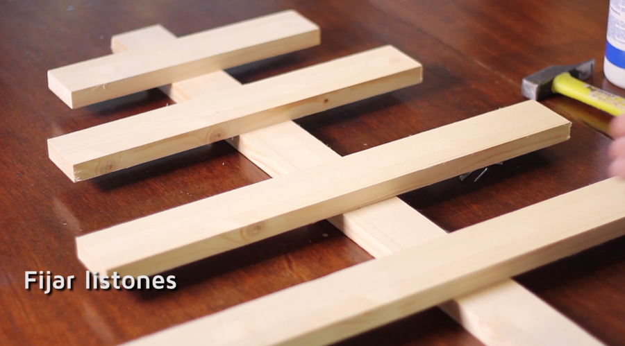 1 Montaje de la estructura. Para ello mediremos y marcaremos la distancia a la que irán los listones horizontales, y los iremos uniendo al listón vertical con clavos y cola blanca.