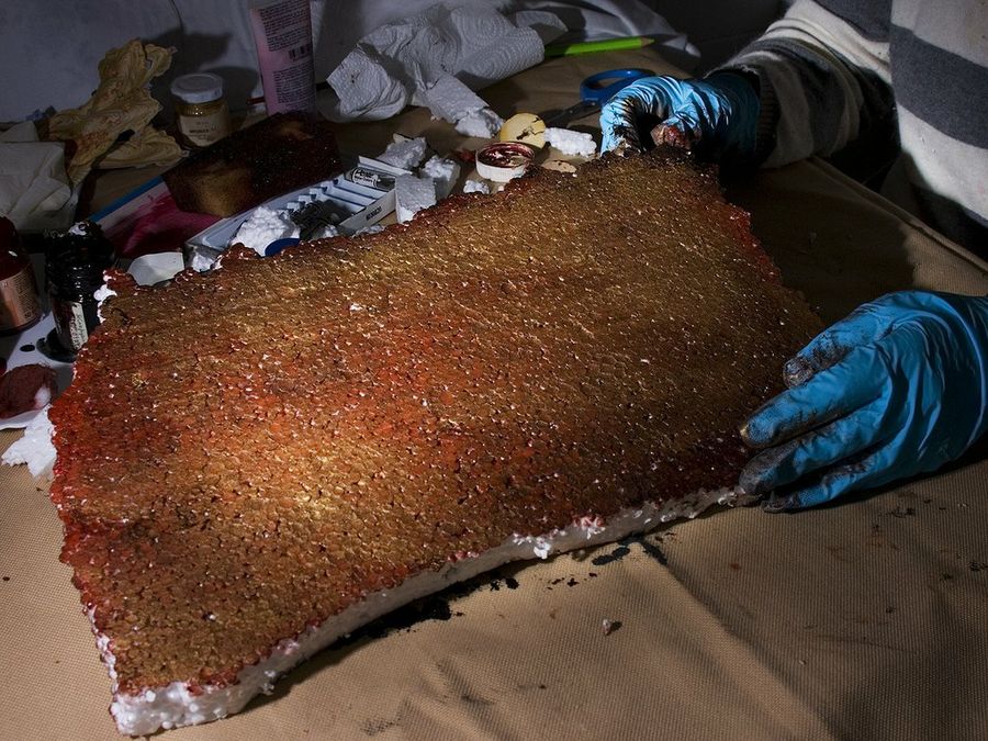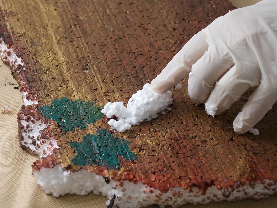 Extendemos bien las pátinas con una esponja sobre la superficie reticulada del corcho, textura que deseamos dejar visible en nuestro diseño.