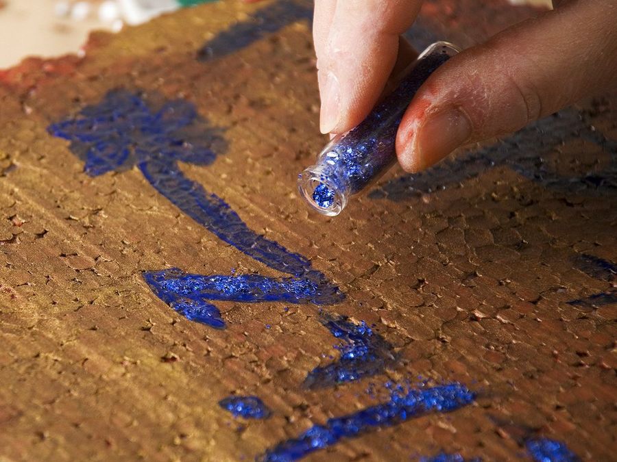 Añadimos una témpera al agua de color dorado, tras dejarla evaporarse ligeramente. La extendemos bien, para que se ligue con las pátinas.