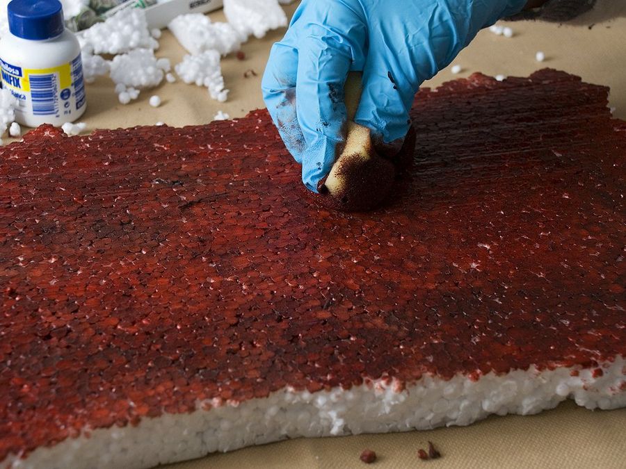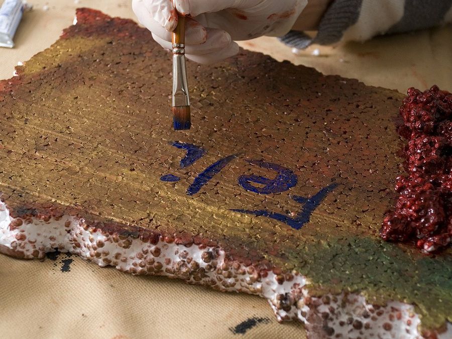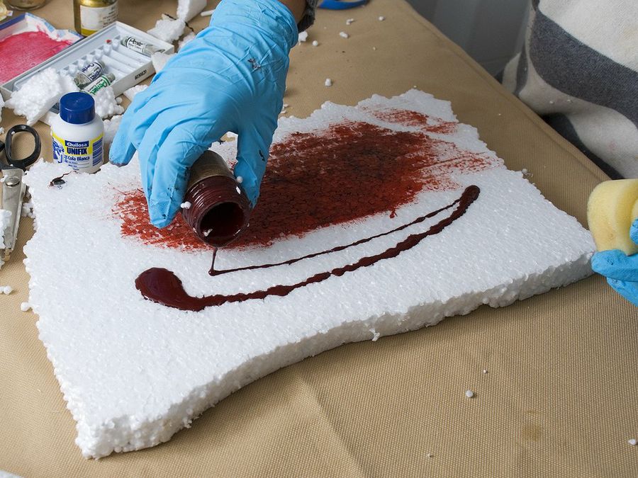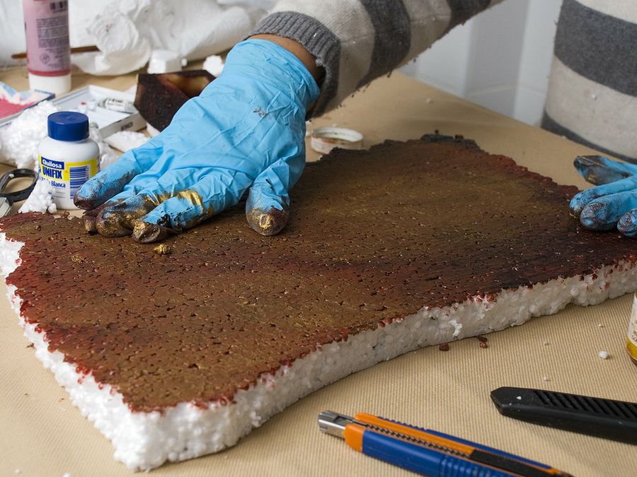 Hemos troceado la plancha con las manos, para conseguir un efecto artesanal muy atractivo. Guardaremos los pedazos menudos que se han desprendido, porque más adelante serán parte protagonista de nuestro diseño. Comenzamos vertiendo directamente sobre el corcho dos pátinas al aceite, de colores rojo y gris. Nos hemos puesto unos guantes de nitrilo que protegen la piel de cualquier irritación.