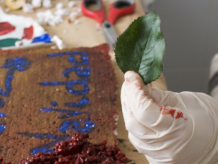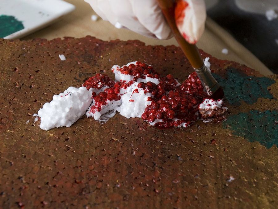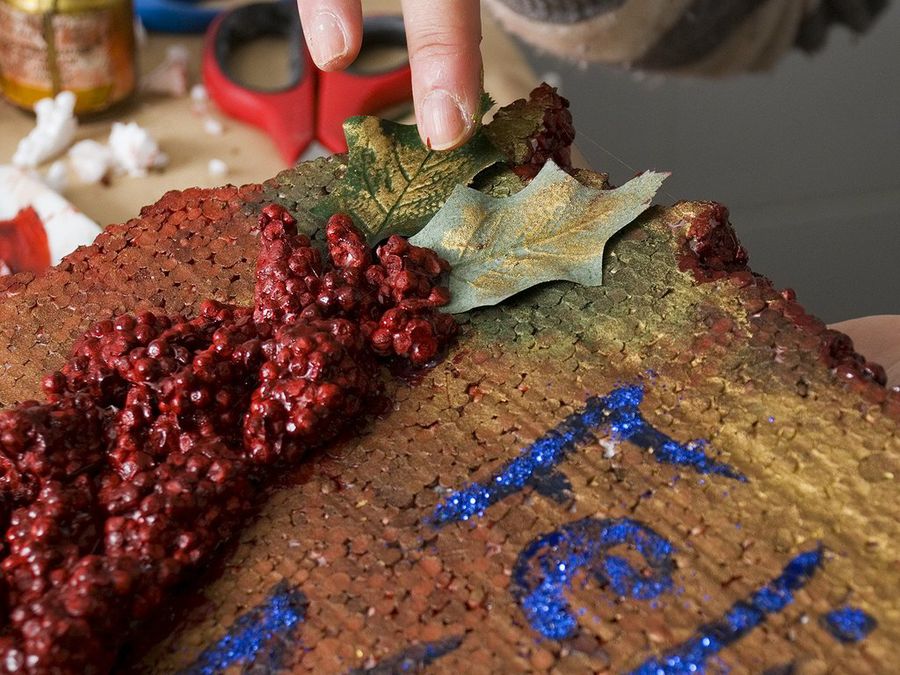 Hemos probado varios adhesivos hasta decantarnos por la cola térmica. Rápidamente va surgiendo un apretado racimo silvestre, que pintamos en intenso color rojo.