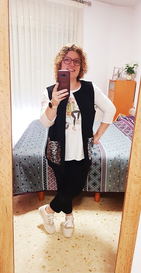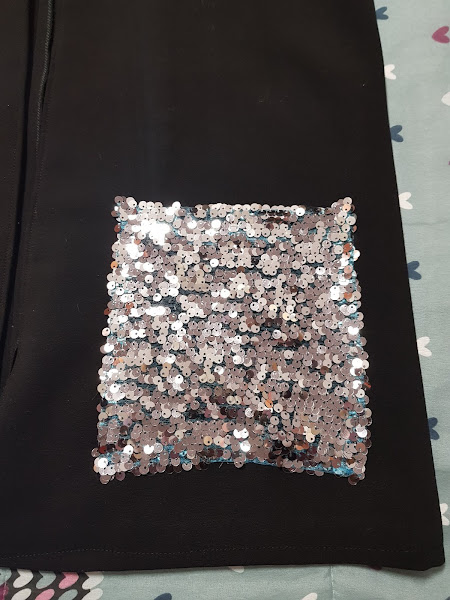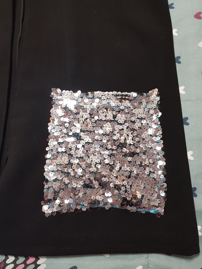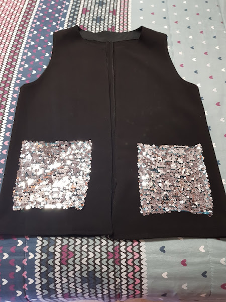 Como el chaleco me iba a quedar muy básico y como no decirlo un poco soso todo de color negro le he cosido con tela de lentejuelas plateadas unos bolsillos de plastón XL para que se vean bien las lentejuelas , que no falta el brilli -brilli ¡¡¡¡¡¡