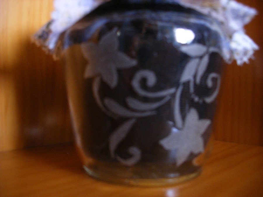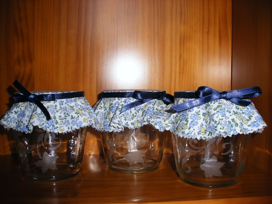 Os presento a mis trillizos........ jajjaja...... reciclaje de unos tarros de mermelada con una forma que me encanta, restos de tela y unas cintas.............Se busca una imagen por la red y se talla en el cristal.........