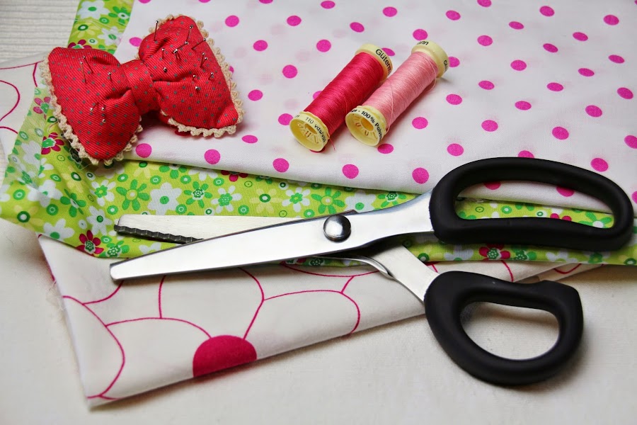 Alfileres, hilo y tijeras de zig-zag
