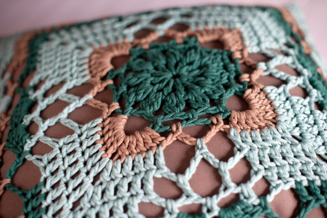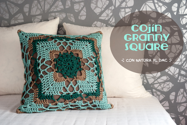 El proyecto inicial que íbamos a hacer esa tarde era una funda para tablet, pero a mi me quedó tan grande que más bien parecía una funda para portátil, y como no tengo tablet, decidí deshacerlo y tirarme de cabeza a por otra labor. Así es como acabé tejiendo un cojín granny square, el patrón del cual lo saqué de la revista de Natura XL con la que nos obsequiaron.