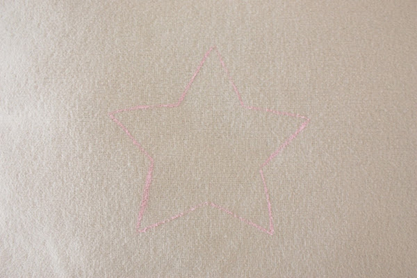 Eliges un motivo, puede ser una forma, una palabra, una frase o un dibujo más elaborado. Yo elegí una estrella porque además ya tenía el patrón. Si no tenéis mano para dibujar, siempre podéis recurrir a internet e imprimir el dibujo elegido. Lo recortáis en cartulina, para que sea más fácil de manejar sin que se arrugue. Y lo ponéis sobre el cojín para empezar a pintar. Primero marcaremos la silueta con un pincel fino y luego corearemos el interior.