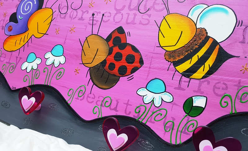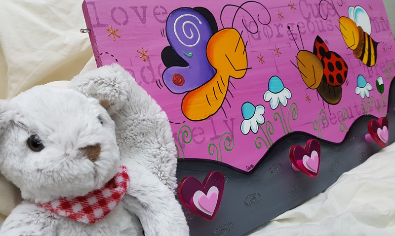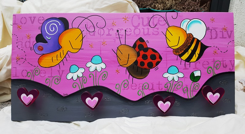 Una madera maciza de pino se convierte en un cuadro con colores muy alegres, y a conjunto, unos tiradores que hacen de colgador.