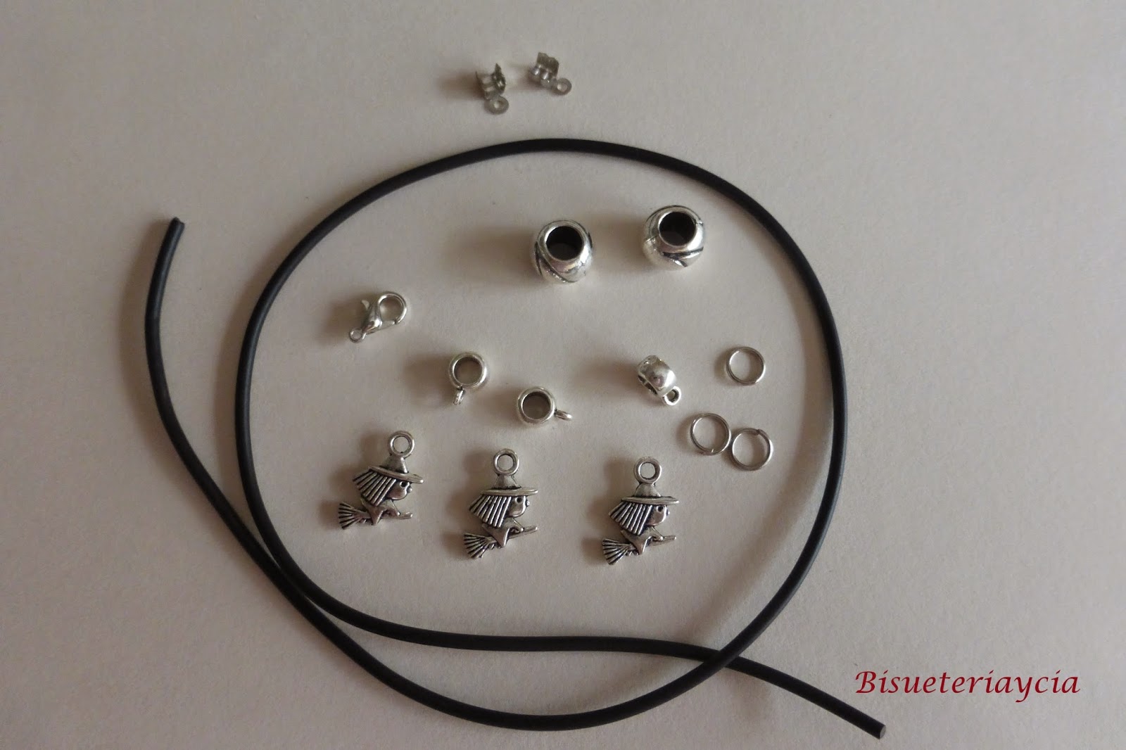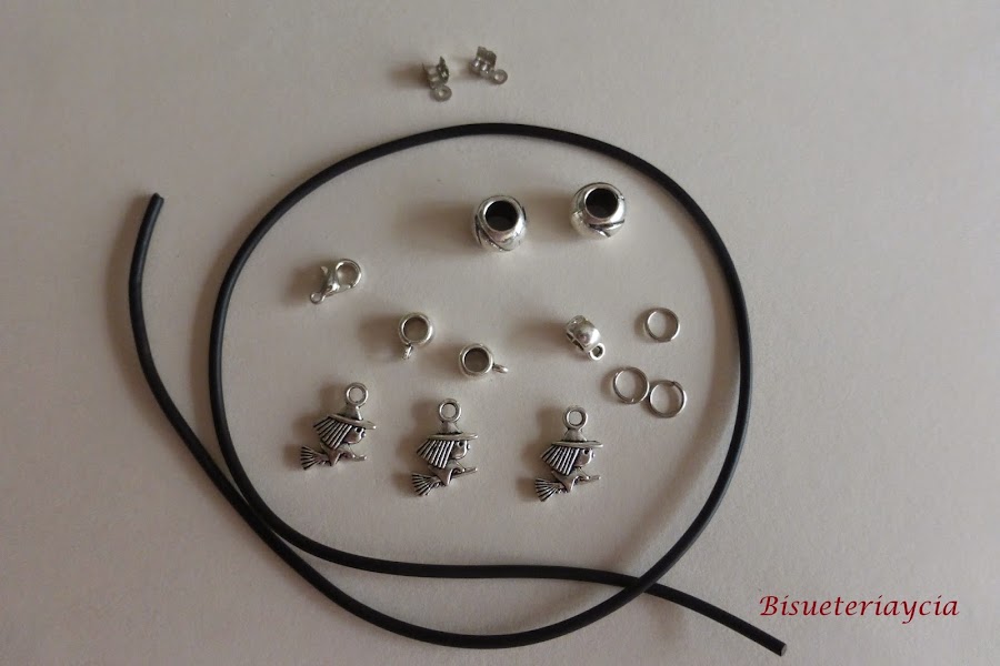 caucho color negro, entrepiezas con colgador, unas bolas plateadas, anillas, unas brujas, terminales y cierre.