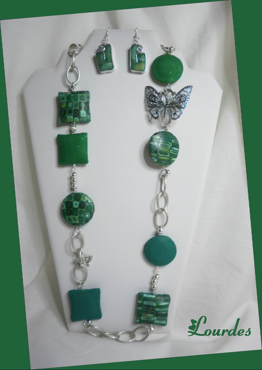 Y con un resto de las piezas de la extrusora pasado por la laminadora, he conseguido estos pendientes que guardan las tonalidades del collar, pero sin empalagar, con tanto cuadradito Aquí os dejo el conjunto al completo. ¿A que voy a estar divina de la muerte?