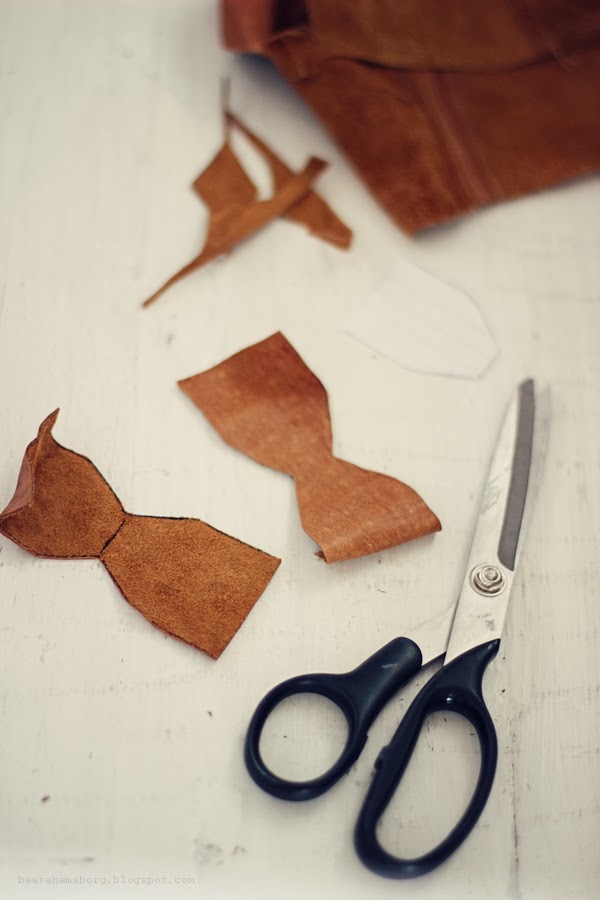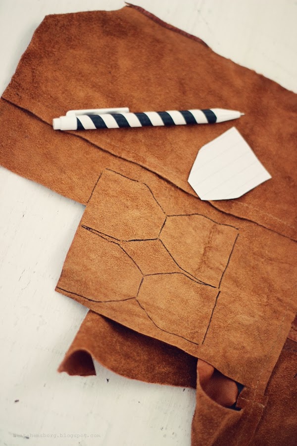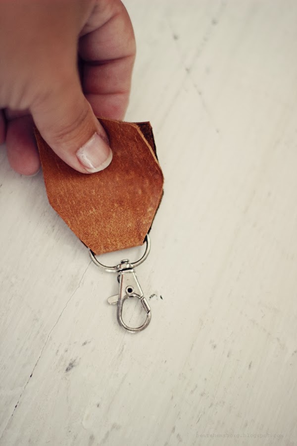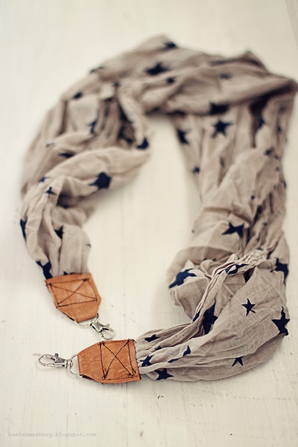 Con un retal de piel se cortan unos pequeños remates y se cosen al pañuelo poniendo previamente un pequeño gancho para la cámara.