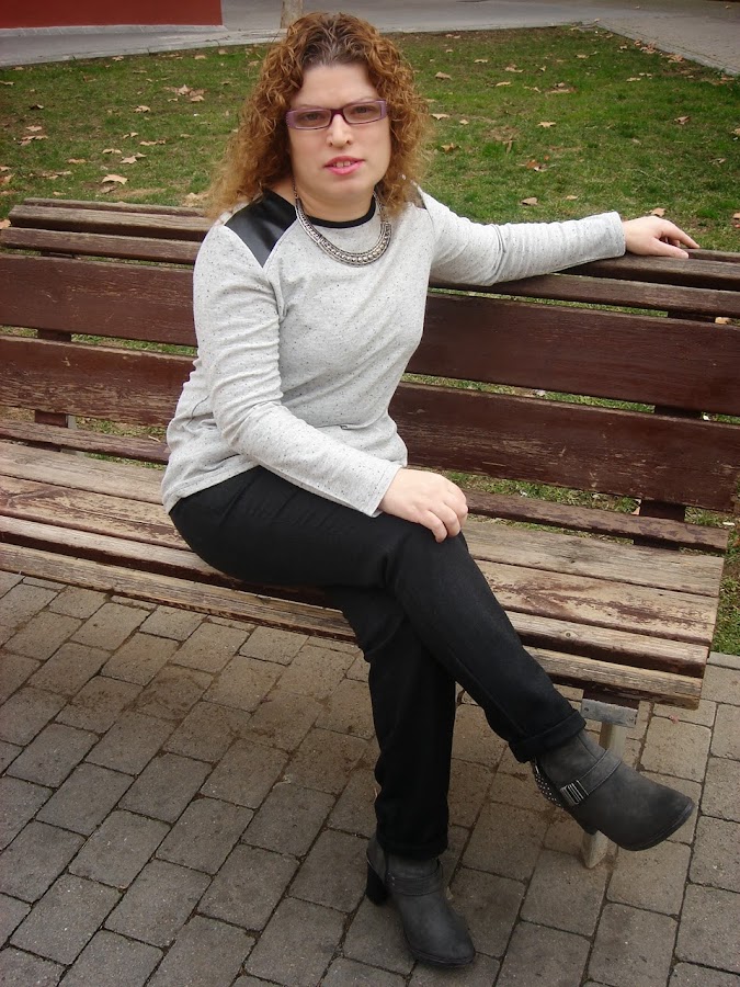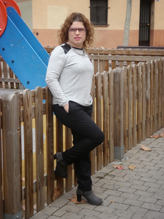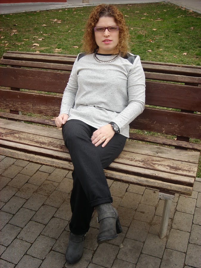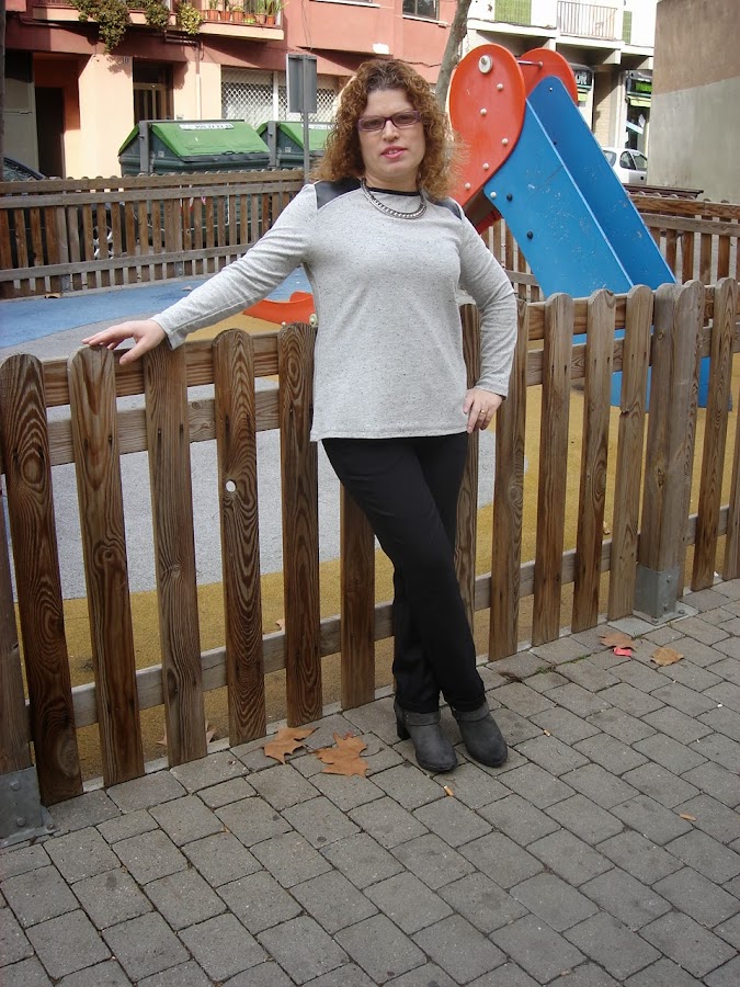 Las camiseta o shirt es sencilla patron recto, cuello redondo y manga montada, pero para darle un aire distinto le he puesto una pieza de polipiel de color negro y en el cuello una tira al bies de punto elastico de color negro.
