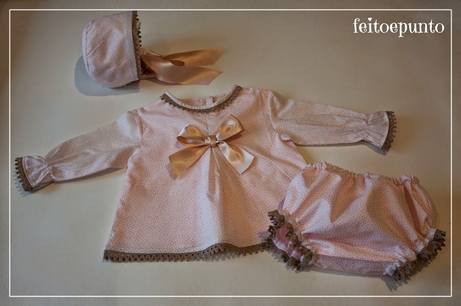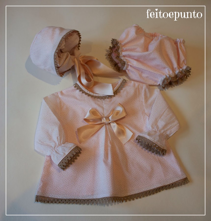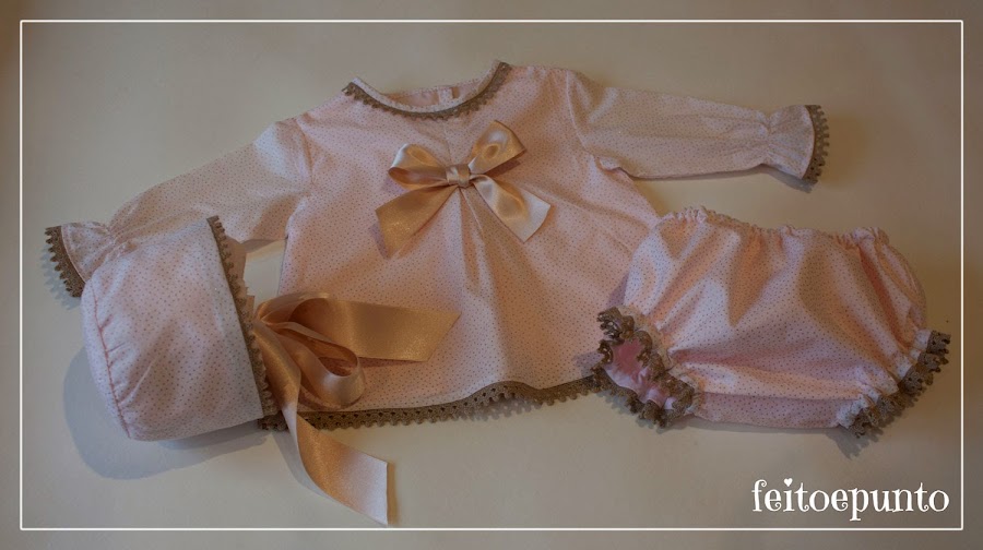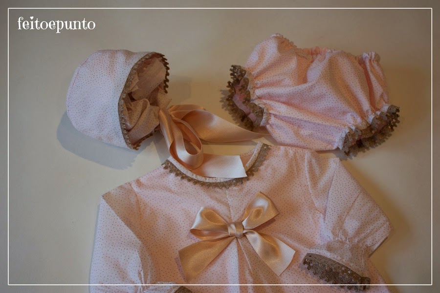 Es una blusita larga, casi un vestido, a juego con su braguita y capota.
