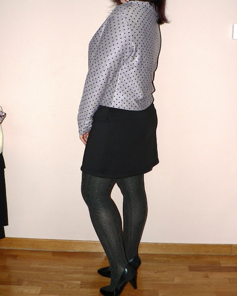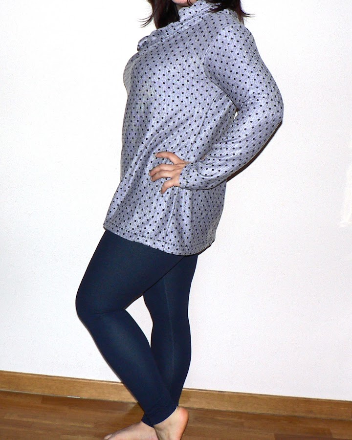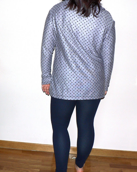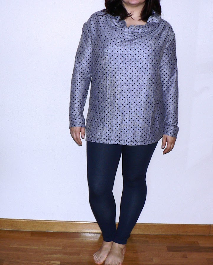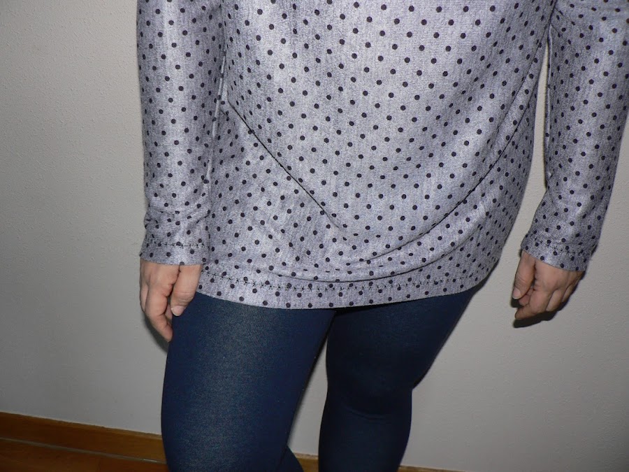 Hice la camiseta con todo su largo, que es bastante, sobre todo para una mujer de 1,58 de altura. Para nochebuena la metí dentro de la falda, pero los días de diario la llevo tal y como la veis, con leggigns y por fuera.