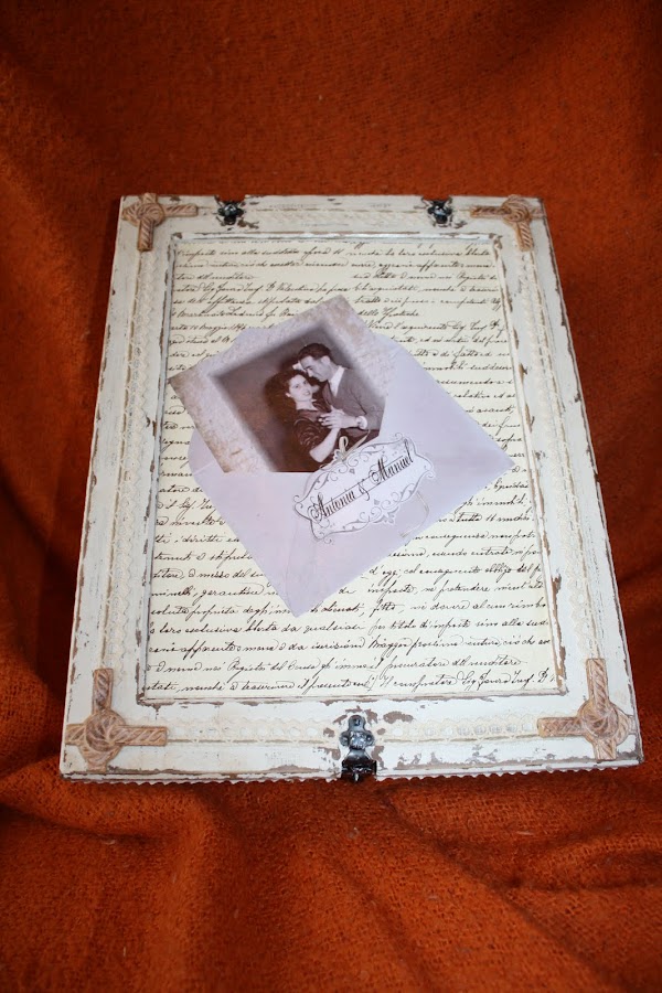 Una lamina de escritura, encima, el montaje que hizo mi Tata con la foto. Unas siluetas en cada esquina......simplemente resaltadas con una patina blanca y envejecidas. Puntillas, ¡¡muchas puntillas¡¡......mi ama es como yo, le encantan las puntillas.......los botones........los hilos......