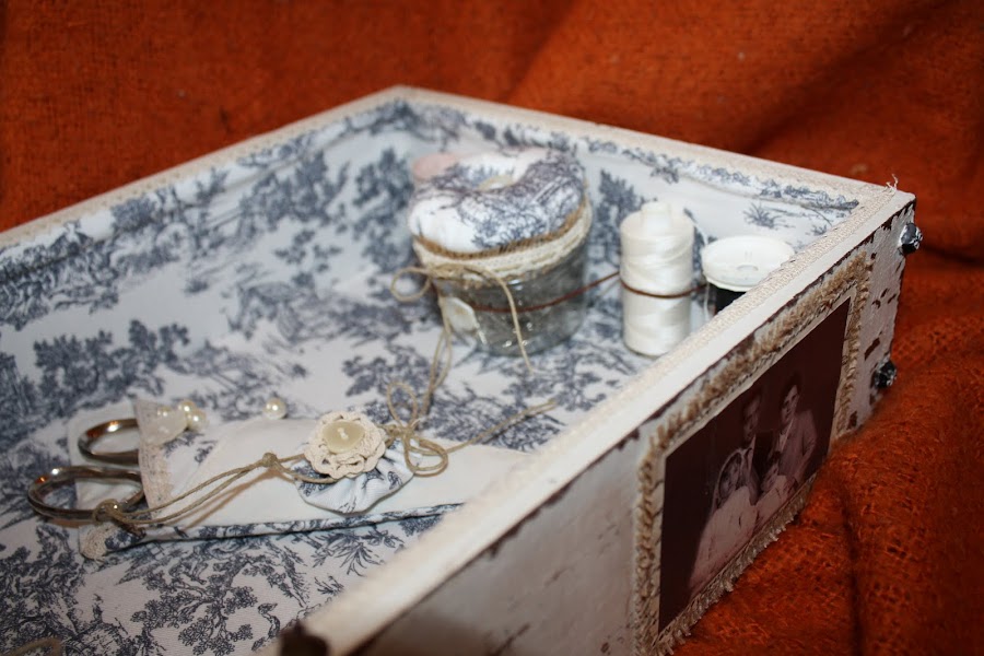 Así que recurrí a los recuerdos......a las fotos.....y todo ellos para embellecer algo tan simple como una caja de vino y transformarla en un costurero. Por que la costura ha sido una de las cosas (junto a la lectura), que mas a entretenido a mi ama. Si cierro los ojos siempre la veo con un libro entre las manos.......