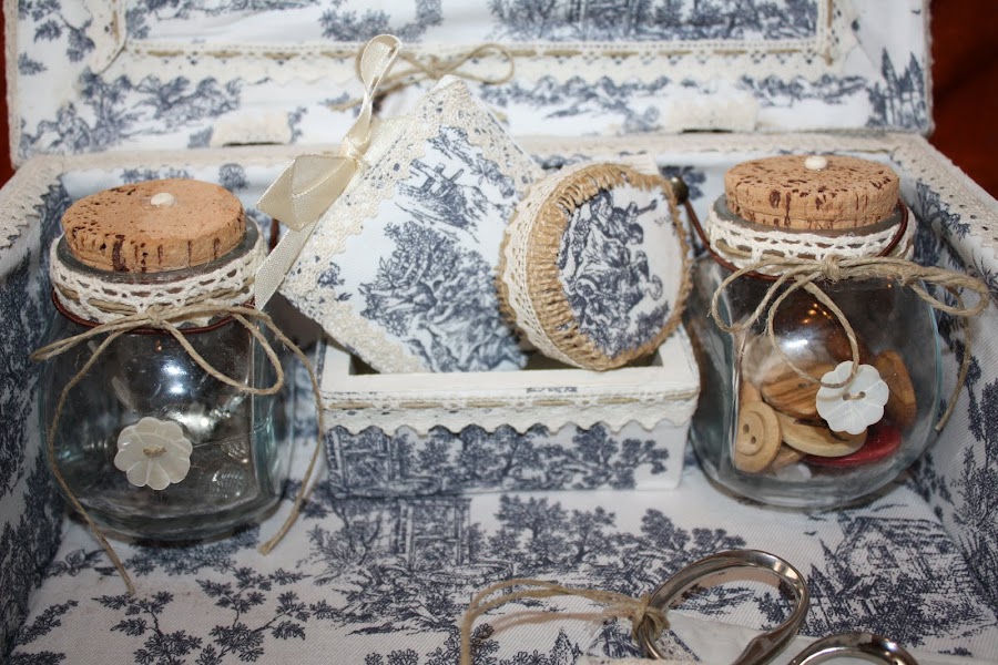 En el otro extremo, dos botecitos (chinorris, reciclaje total), para los botones y los dedales.......en el medio una cajita forrada y pegada donde poner el metro (forrado) y el guarda-agujas.