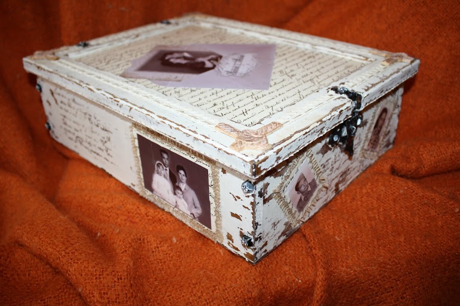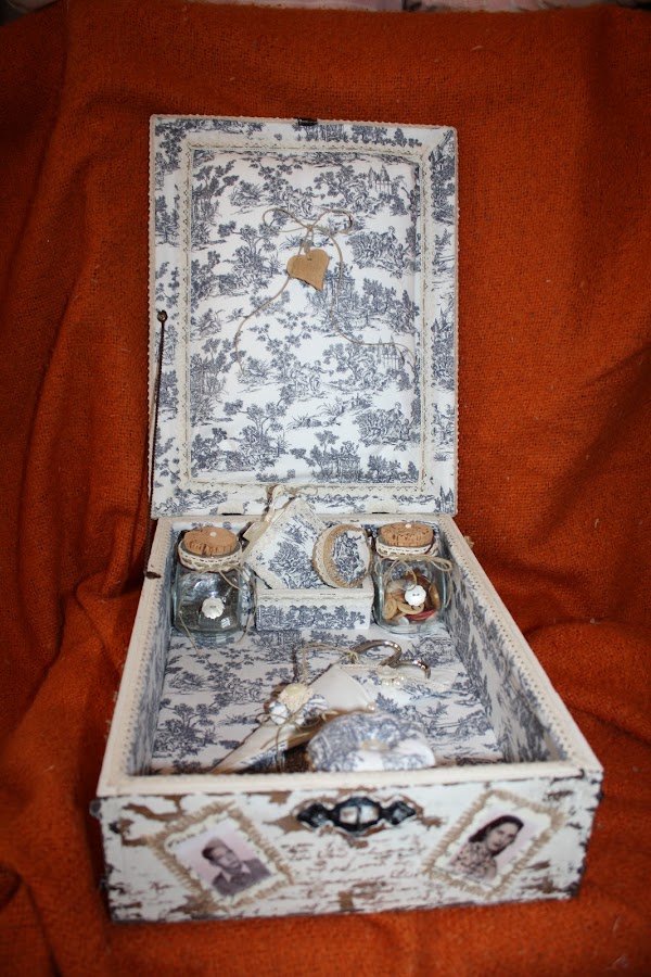 La caja la lije bien, le dí vela en diferentes puntos, un par de manos de blanco roto............y ¡¡decaparla¡¡. Nada mas, sobre eso empecé a jugar.........decoupage, tela, puntillas, sellos, siluetas...........