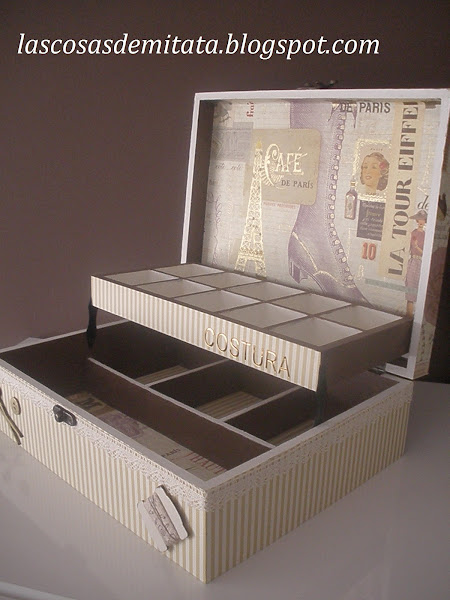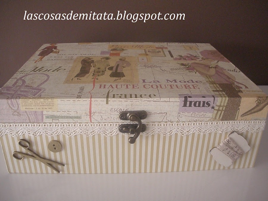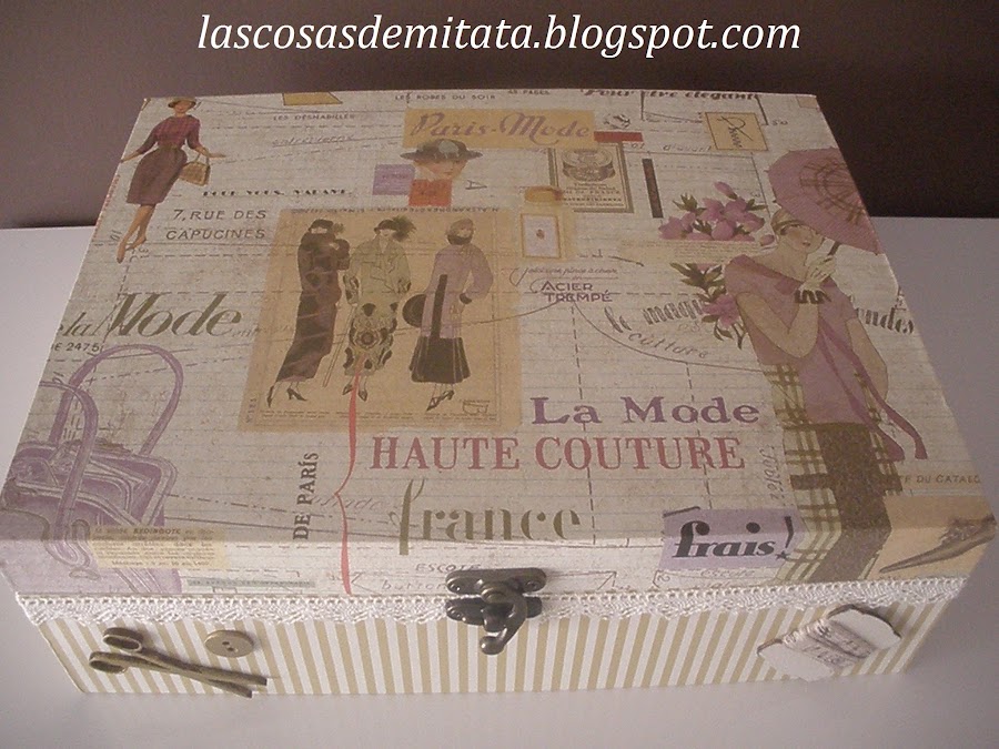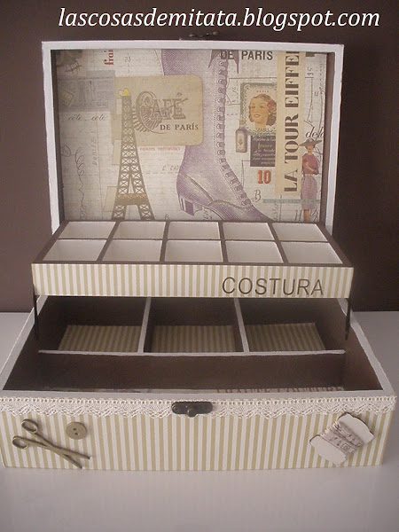Hoy os traigo un Costurero muy Parisino que saldrá en breve con destino a Espera ( Cádiz ), su destinataria es de nuevo Rosario. Ella quería un costurero en caja de madera con compartimentos donde poder guardar sus cositas de costura, eligió un papel que es una monada, si os fijáis tiene como unos destellos dorados y referencias a la moda, me encanta!! combinado con unas rayas en beig.