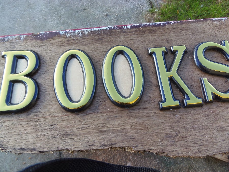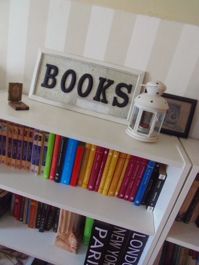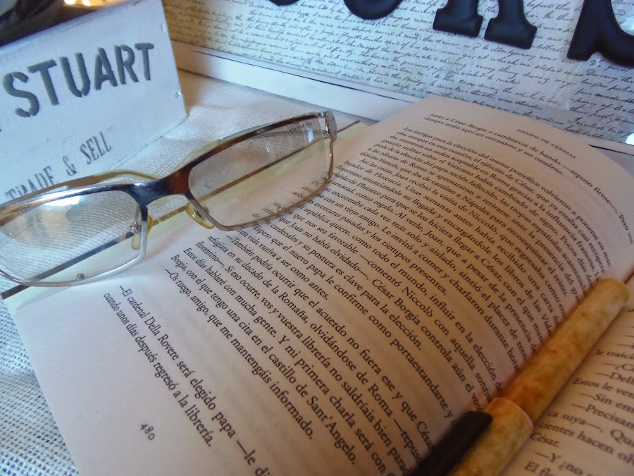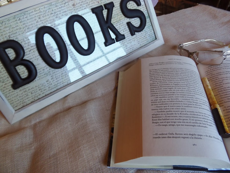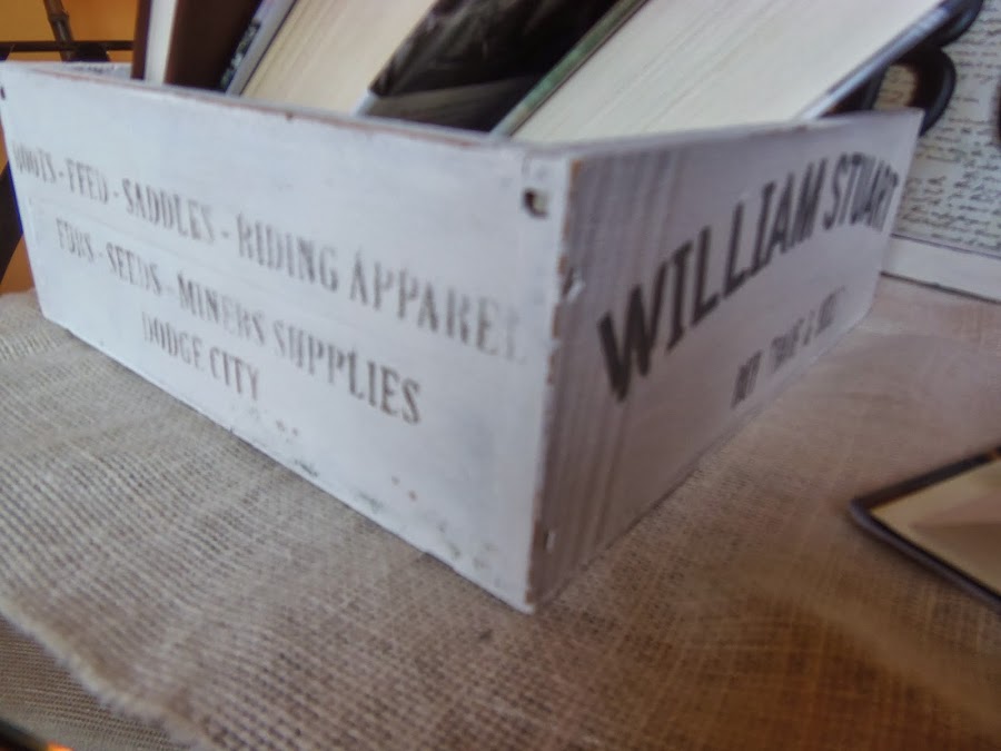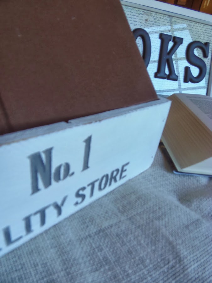 Una caja de vino sin tapa decorada con stencil sirve de contenedor para los libros pendientes de lectura,uno de los placeres de la vida,leer!!