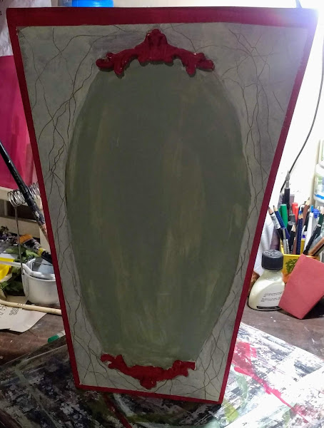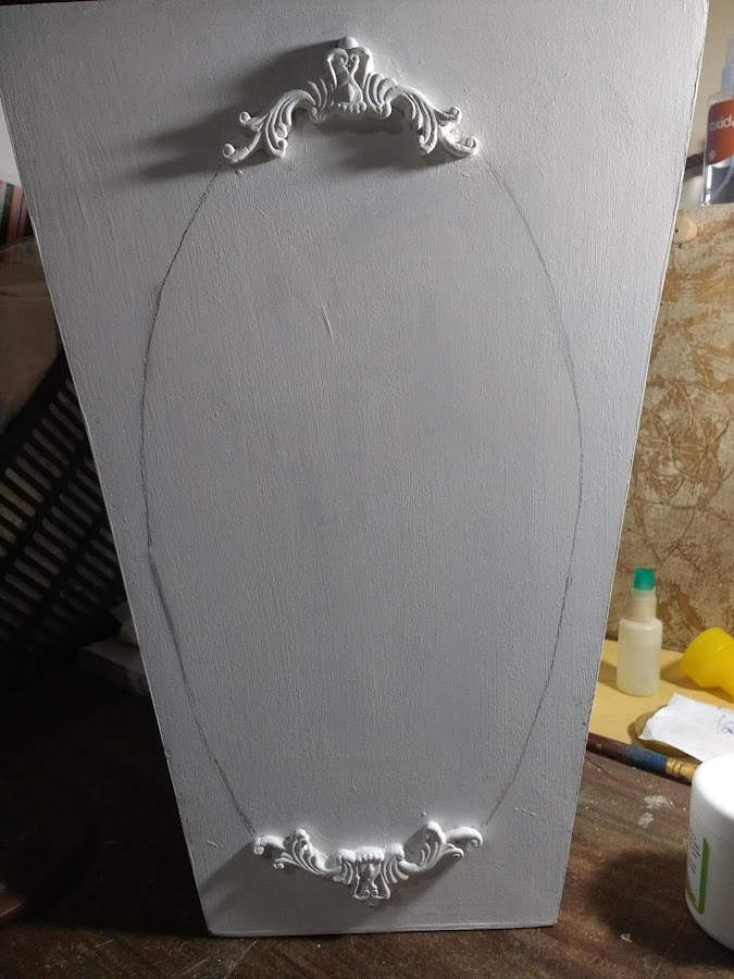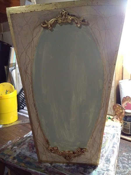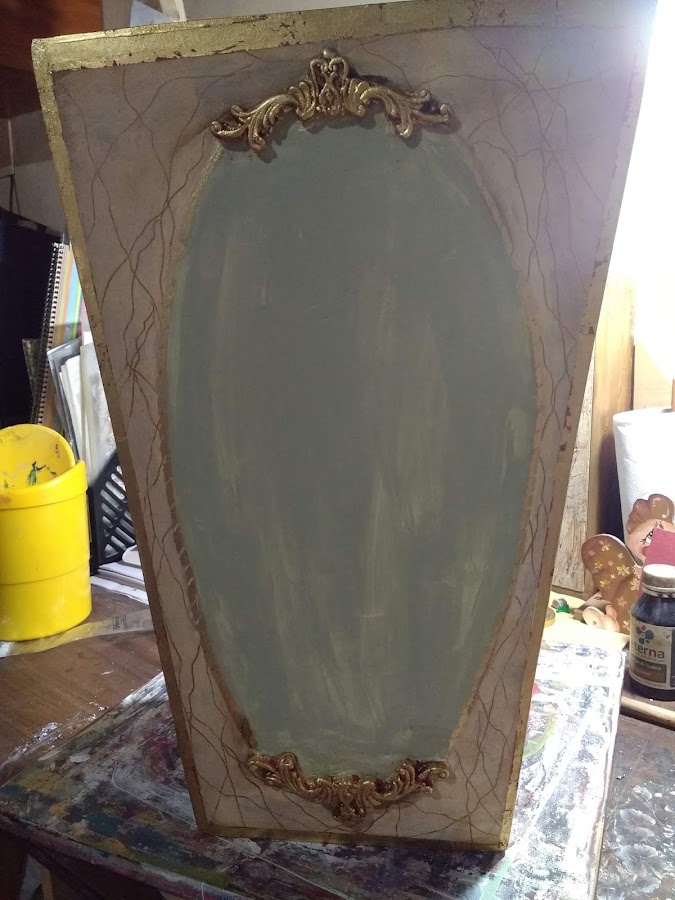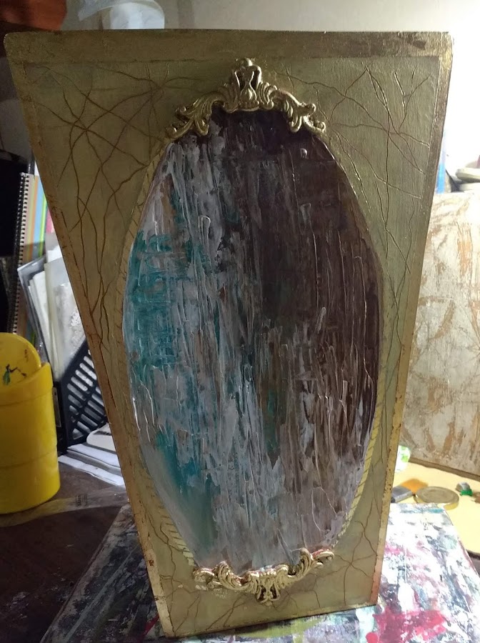 Podemos aplicar dorado en algunas zonas del fondo con espátula plana en forma suave tratando de dar la sensación de un efecto desgastado. El trabajo se protege con barniz