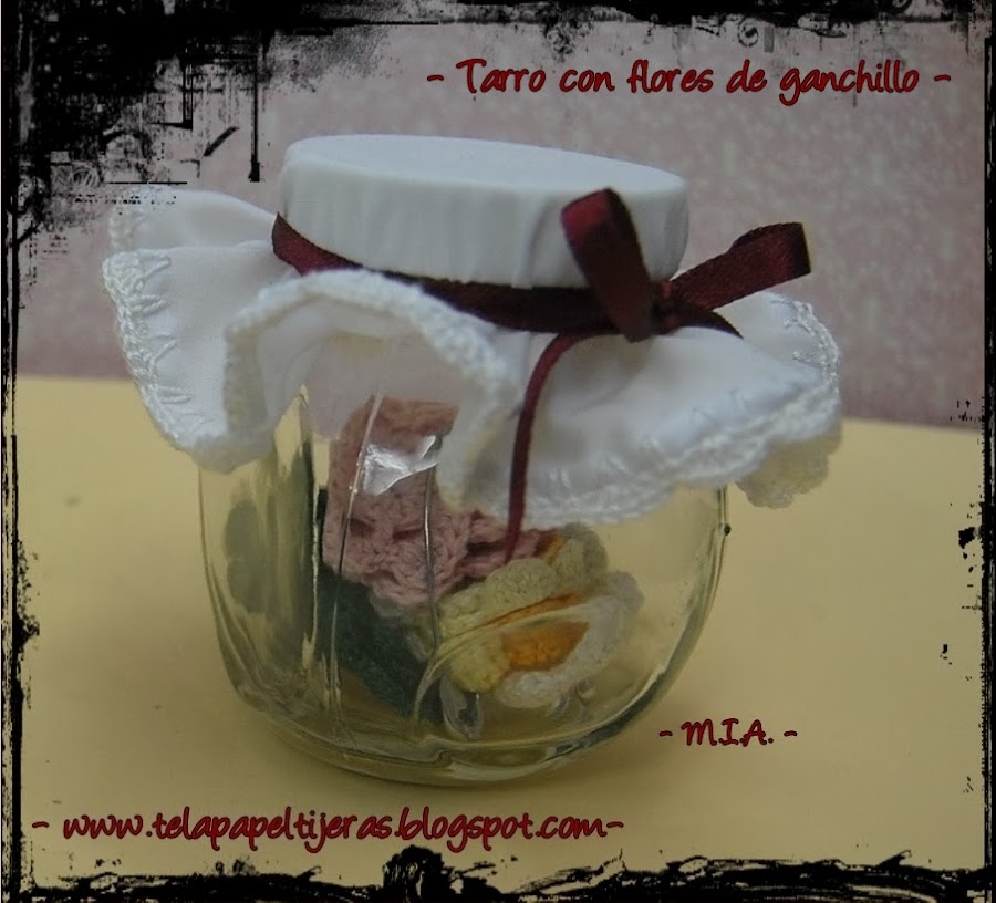 Un tarro con una flores de ganchillo que espero use en sus trabajos costuriles o scraperos...