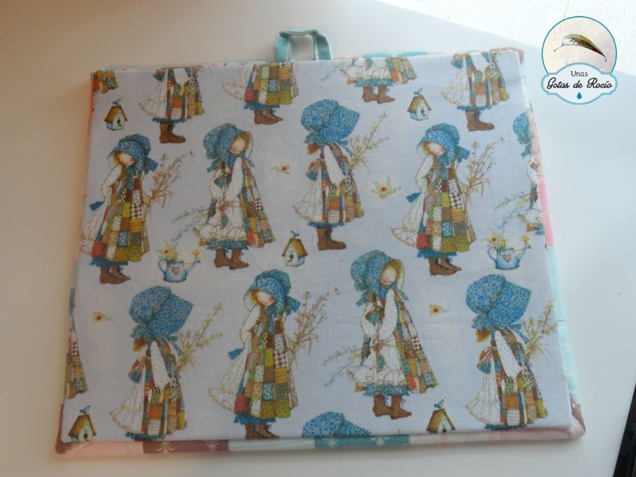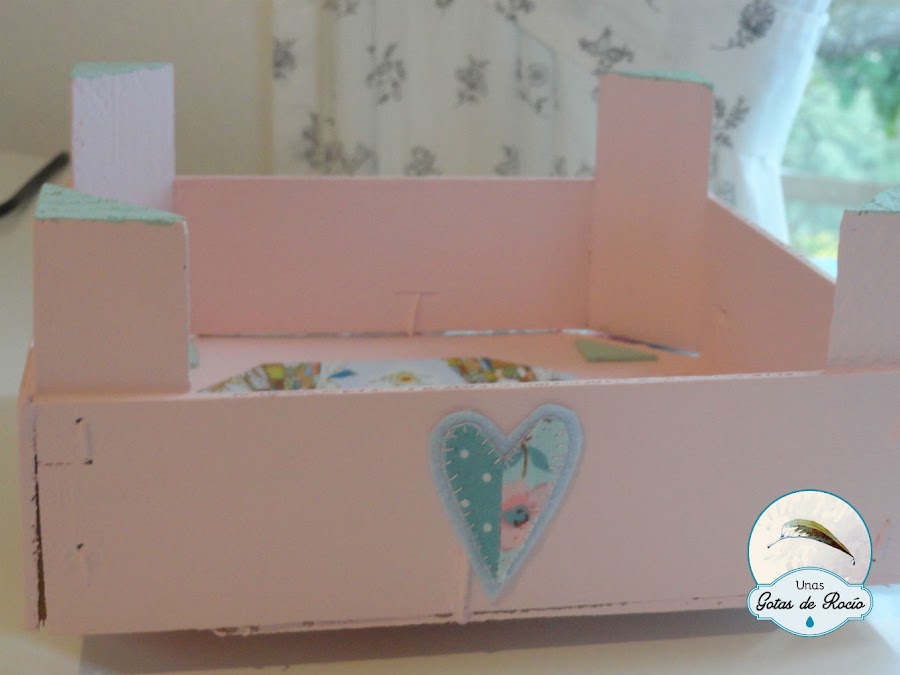 Y la caja de fresas que le decoré va pintada con pintura a la tiza en rosa, con un cartel en el frontal donde pone "Costura" para guardar lo que mejor le convenga. En los otros tres frentes, corazones con las mismas telas y en el interior un corazón más además de un pequeño adorno que forme conjunto con la mini tabla de plancha.