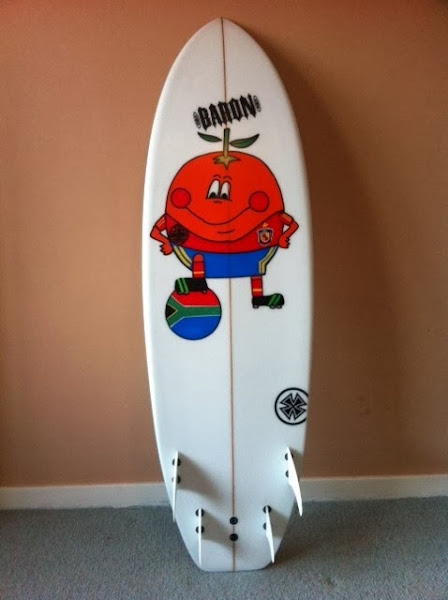 Viendo algunas entradas de su blog, de repente di con una en la que nos contaban que Víctor se había hecho una tabla de surf personalizada. ¡No me lo podía creer! Allí estaba la tabla real de Víctor, con el dibujo que él había elegido para decorarla. Y no me digáis que no es algo auténticamente español: