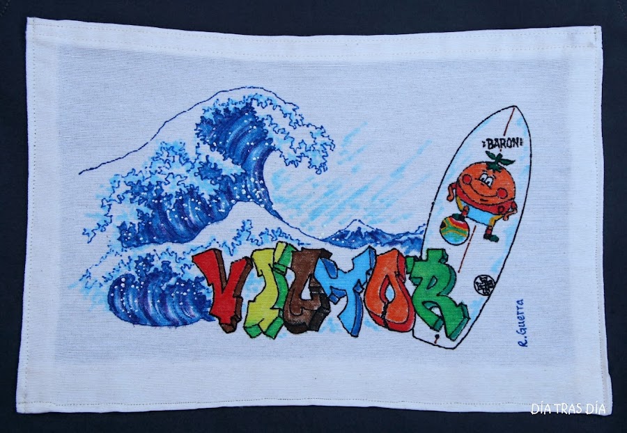 La idea inicial fue hacer en el delantal un dibujo con un personaje haciendo surf, ya que es una de las pasiones de Víctor. Después, seguimos evolucionando la idea y pensamos en que llevase a Víctor con sus dos hijas, Alba y Candela, los 3 surfeando. Y al final, como Eva no terminaba de ver que llevase personajes del estilo de los que hice para el mantel de su madre, le dimos un poco la vuelta a la idea inicial y me planteó que si podría hacerse algún dibujo tipo graffiti.