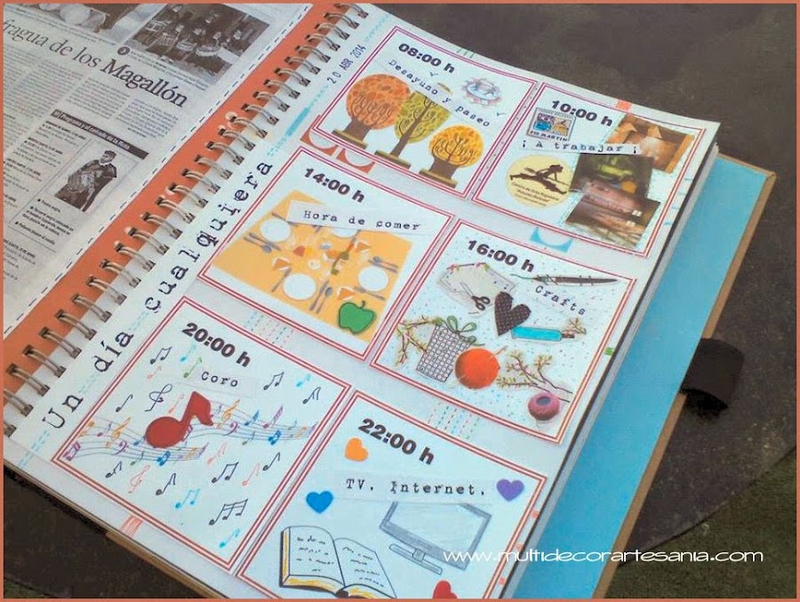 Esta es una nueva página en mi Smash Book y con ella participo en el reto nº 67 de Retos de Scrap, el título lo dice todo, había que plasmar sobre papel y utilizando la técnica del scrapbooking "Un día cualquiera" de nuestra vida, desde la mañana hasta la noche.